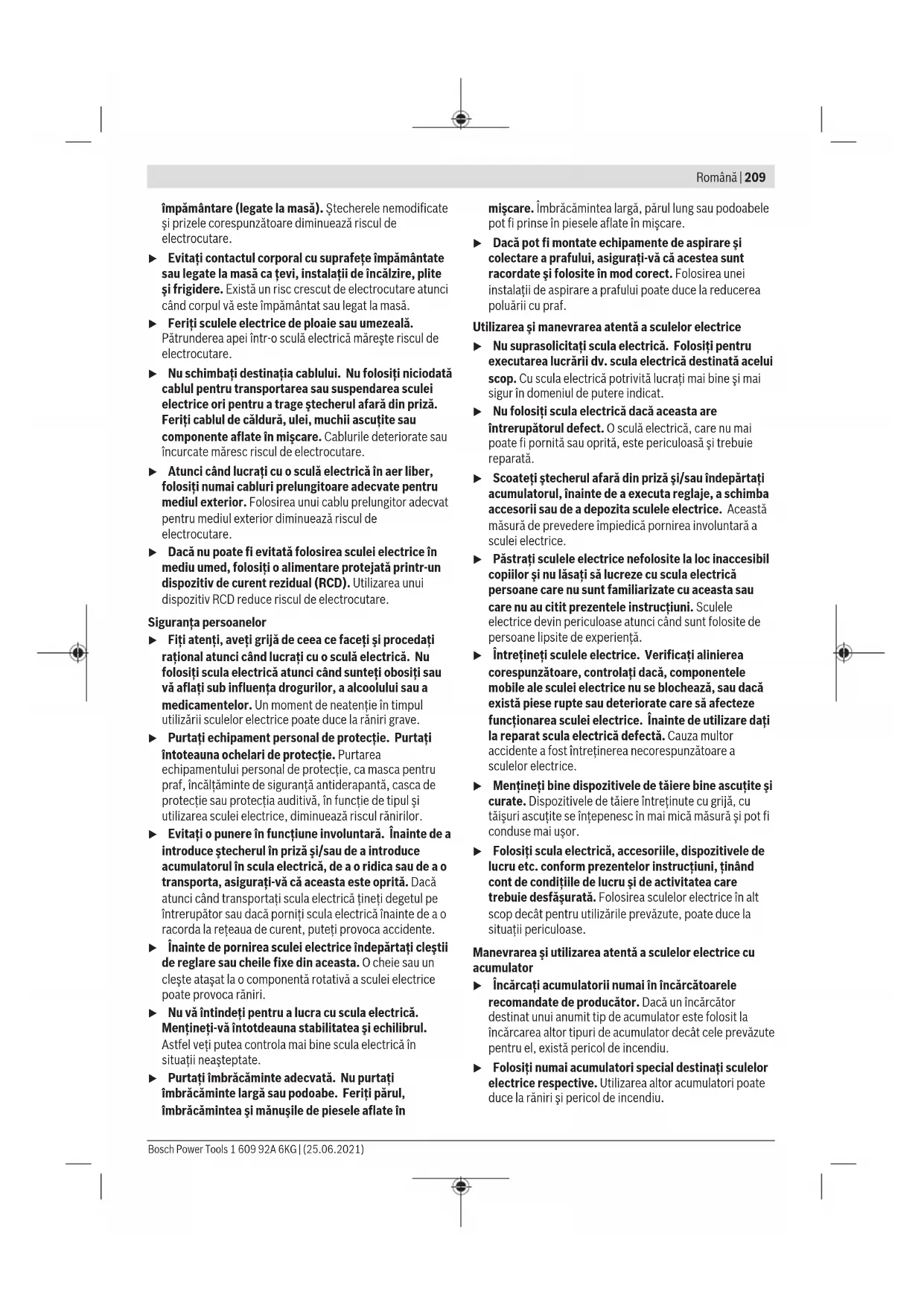 Бұл литий-иондық аккумуляторлар қауіпті тауарларға қойылатын талаптарға сай болуы керек. Пайдаланушы аккумуляторларды көшеде қосымша құжаттарсыз тасымалдай алады. Үшінші тұлғалар (мысалы, әуе көлігі немесе жіберу) орамаға және маркаларға қойылатын арнайы талаптарды сақтау керек. Жіберуге дайындау кезінде қауіпті жүктерді тасымалдау маманымен хабарласу керек. Аккумуляторды корпусы зақымдалған болса ғана жіберіңіз. Ашық түйіспелерді желімдеңіз және аккумуляторды орамада қозғалмайтындай ораңыз. Қажет болса, қосымша ұлттық ережелерді сақтаңыз. Кәдеге жарату Электр құралдарды, аккумуляторларды, керек-жарақтарды және орау материалдарын экологиялық тұрғыдан дұрыс утилизациялауға тапсыру керек. Электр құралдарды және аккумуляторларды/ батареяларды үй қоқысына тастамаңыз! Тек қана ЕО елдері үшін: Еуропа 2012/19/EU ережесі бойынша жарамсыз электр құралдары және Еуропа 2006/66/EC ережесі бойынша зақымдалған немесе ескі аккумулятор/батареялар бөлек жиналып кәдеге жаратылуы қажет. Аккумуляторлар/батареялар: Литий-иондық: Тасымалдау бөліміндегі нұсқауларды орындаңыз (қараңыз „Тасымалдау“, Бет208). Română Instrucţiuni de siguranţă Indicaţii generale de avertizare pentru scule electrice AVERTIS- MENT Citiţi toate indicaţiile de avertizare şi instrucţiunile. Nerespectarea indicaţiilor de avertizare şi a instrucţiunilor poate provoca electrocutare, incendii şi/sau răniri grave. Păstraţi toate indicaţiile de avertizare şi instrucţiunile în vederea utilizărilor viitoare. Termenul "sculă electrică" folosit în indicaţiile de avertizare se referă la sculele electrice alimentate de la reţea (cu cablu de alimentare) sau la sculele electrice cu acumulator (fără cablu de alimentare). Siguranţa la locul de muncă u Menţineţi‑vă sectorul de lucru curat şi bine iluminat. Dezordinea sau sectoarele de lucru neluminate pot duce la accidente. u Nu lucraţi cu sculele electrice în mediu cu pericol de explozie, în care există lichide, gaze sau pulberi inflamabile. Sculele electrice generează scântei care pot aprinde praful sau vaporii. u Nu permiteţi accesul copiilor şi al spectatorilor în timpul utilizării sculei electrice. Dacă vă este distrasă atenţia puteţi pierde controlul. Siguranţă electrică u Ştecherul sculei electrice trebuie să fie potrivit prizei electrice. Nu modificaţi niciodată ştecherul. Nu folosiţi fişe adaptoare la sculele electrice cu 1 609 92A 6KG | (25.06.2021) Bosch Power ToolsRomână | 209 împământare (legate la masă). Ştecherele nemodificate şi prizele corespunzătoare diminuează riscul de electrocutare. u Evitaţi contactul corporal cu suprafeţe împământate sau legate la masă ca ţevi, instalaţii de încălzire, plite şi frigidere. Există un risc crescut de electrocutare atunci când corpul vă este împământat sau legat la masă. u Feriţi sculele electrice de ploaie sau umezeală. Pătrunderea apei într‑o sculă electrică măreşte riscul de electrocutare. u Nu schimbaţi destinaţia cablului. Nu folosiţi niciodată cablul pentru transportarea sau suspendarea sculei electrice ori pentru a trage ştecherul afară din priză. Feriţi cablul de căldură, ulei, muchii ascuţite sau componente aflate în mişcare. Cablurile deteriorate sau încurcate măresc riscul de electrocutare. u Atunci când lucraţi cu o sculă electrică în aer liber, folosiţi numai cabluri prelungitoare adecvate pentru mediul exterior. Folosirea unui cablu prelungitor adecvat pentru mediul exterior diminuează riscul de electrocutare. u Dacă nu poate fi evitată folosirea sculei electrice în mediu umed, folosiţi o alimentare protejată printr-un dispozitiv de curent rezidual (RCD). Utilizarea unui dispozitiv RCD reduce riscul de electrocutare. Siguranţa persoanelor u Fiţi atenţi, aveţi grijă de ceea ce faceţi şi procedaţi raţional atunci când lucraţi cu o sculă electrică. Nu folosiţi scula electrică atunci când sunteţi obosiţi sau vă aflaţi sub influenţa drogurilor, a alcoolului sau a medicamentelor. Un moment de neatenţie în timpul utilizării sculelor electrice poate duce la răniri grave. u Purtaţi echipament personal de protecţie. Purtaţi întoteauna ochelari de protecţie. Purtarea echipamentului personal de protecţie, ca masca pentru praf, încălţăminte de siguranţă antiderapantă, casca de protecţie sau protecţia auditivă, în funcţie de tipul şi utilizarea sculei electrice, diminuează riscul rănirilor. u Evitaţi o punere în funcţiune involuntară. Înainte de a introduce ştecherul în priză şi/sau de a introduce acumulatorul în scula electrică, de a o ridica sau de a o transporta, asiguraţi‑vă că aceasta este oprită. Dacă atunci când transportaţi scula electrică ţineţi degetul pe întrerupător sau dacă porniţi scula electrică înainte de a o racorda la reţeaua de curent, puteţi provoca accidente. u Înainte de pornirea sculei electrice îndepărtaţi cleştii de reglare sau cheile fixe din aceasta. O cheie sau un cleşte ataşat la o componentă rotativ