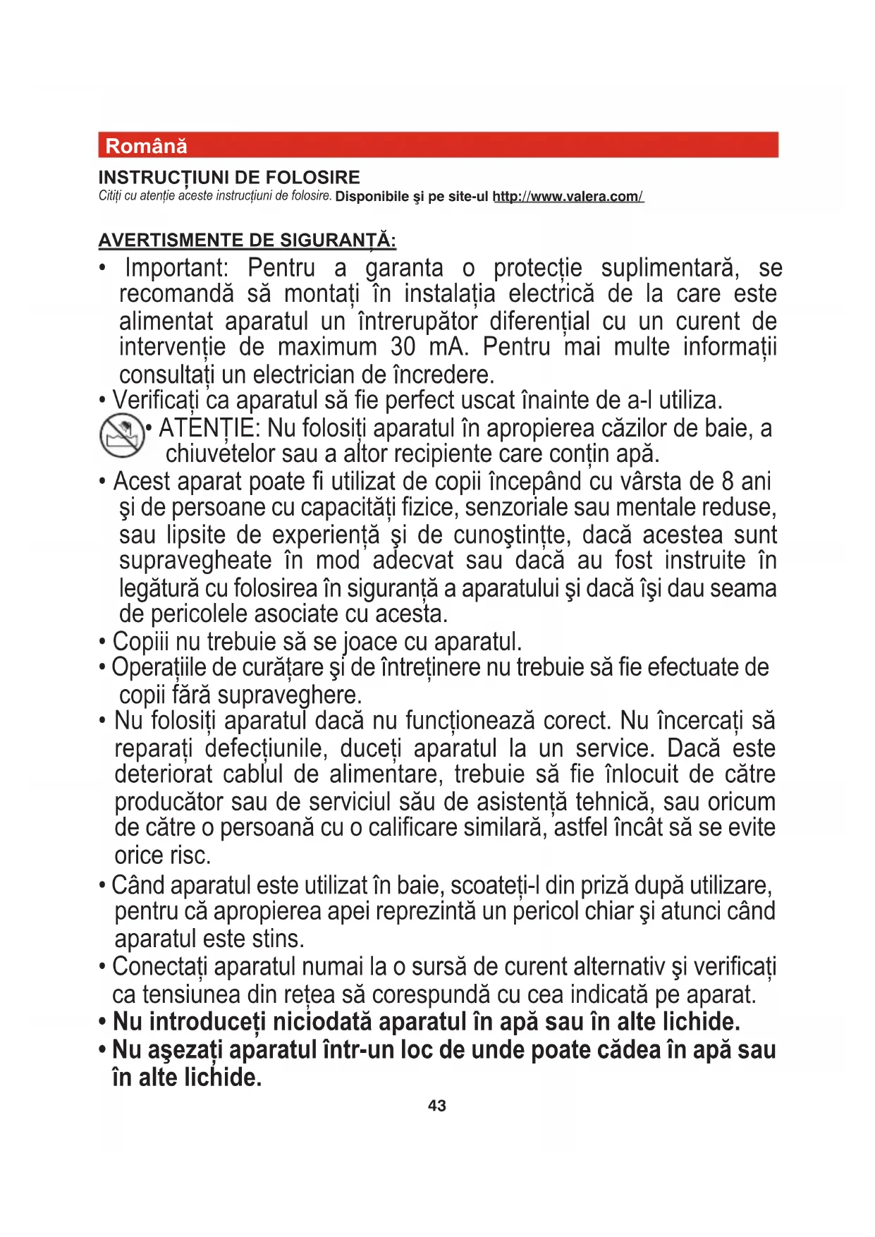 Citiţi cu atenţie aceste instrucţiuni de folosire. Disponibile şi pe site-ul http://www.valera.com/ AVERTISMENTE DE SIGURANŢĂ: