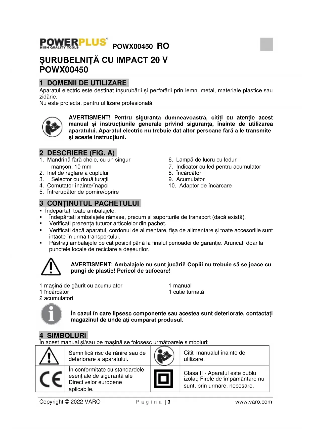 Clasa II - Aparatul este dublu izolat; Firele de împământare nu sunt, prin urmare, necesare.POWX00450 RO Copyright © 2022 VARO P a g i n a | 4 www.varo.com