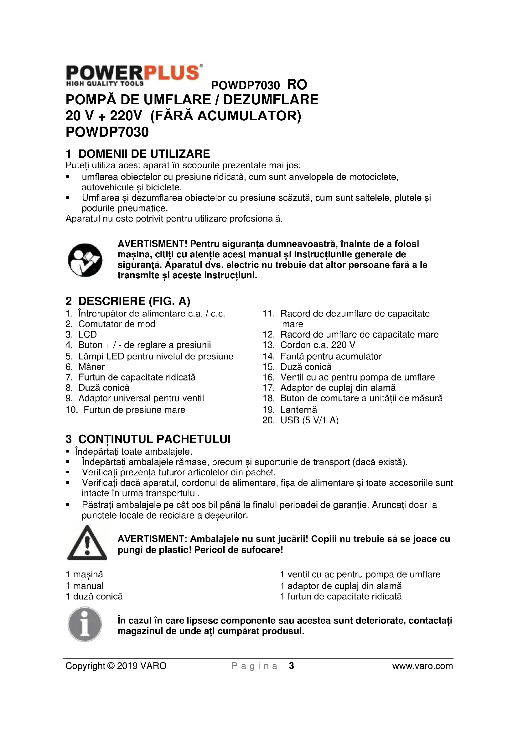 AVERTISMENT: Nu umflați excesiv obiectul pe care îl umflați. AVERTISMENT: Pentru a reduce pericolul de vătămare gravă, opriți aparatul și îndepărtați acumulatorul înainte de a face reglaje sau de aPOWDP7030 RO Copyright © 2019 VARO P a g i n a | 9 www.varo.com demonta/monta accesorii sau anexe. Pornirea accidentală poate provoca vătămarea.