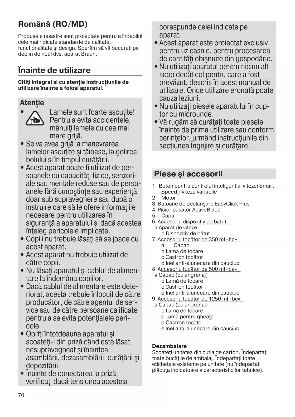 info@braunhousehold.com.tr 5722113444_01_MQ 7000x_7045x_INT_S6-96.indd 695722113444_01_MQ 7000x_7045x_INT_S6-96.indd 69 04.07.19 13:5404.07.19 13:5470 Română (RO/MD) Produsele noastre sunt proiectate pentru a îndeplini cele mai ridicate standarde de calitate, funcţionalitate şi design. Sperăm să vă bucuraţi pe deplin de noul dvs. aparat Braun. Înainte de utilizare Citiţi integral şi cu atenţie instrucţiunile de utilizare înainte a folosi aparatul. Atenţie