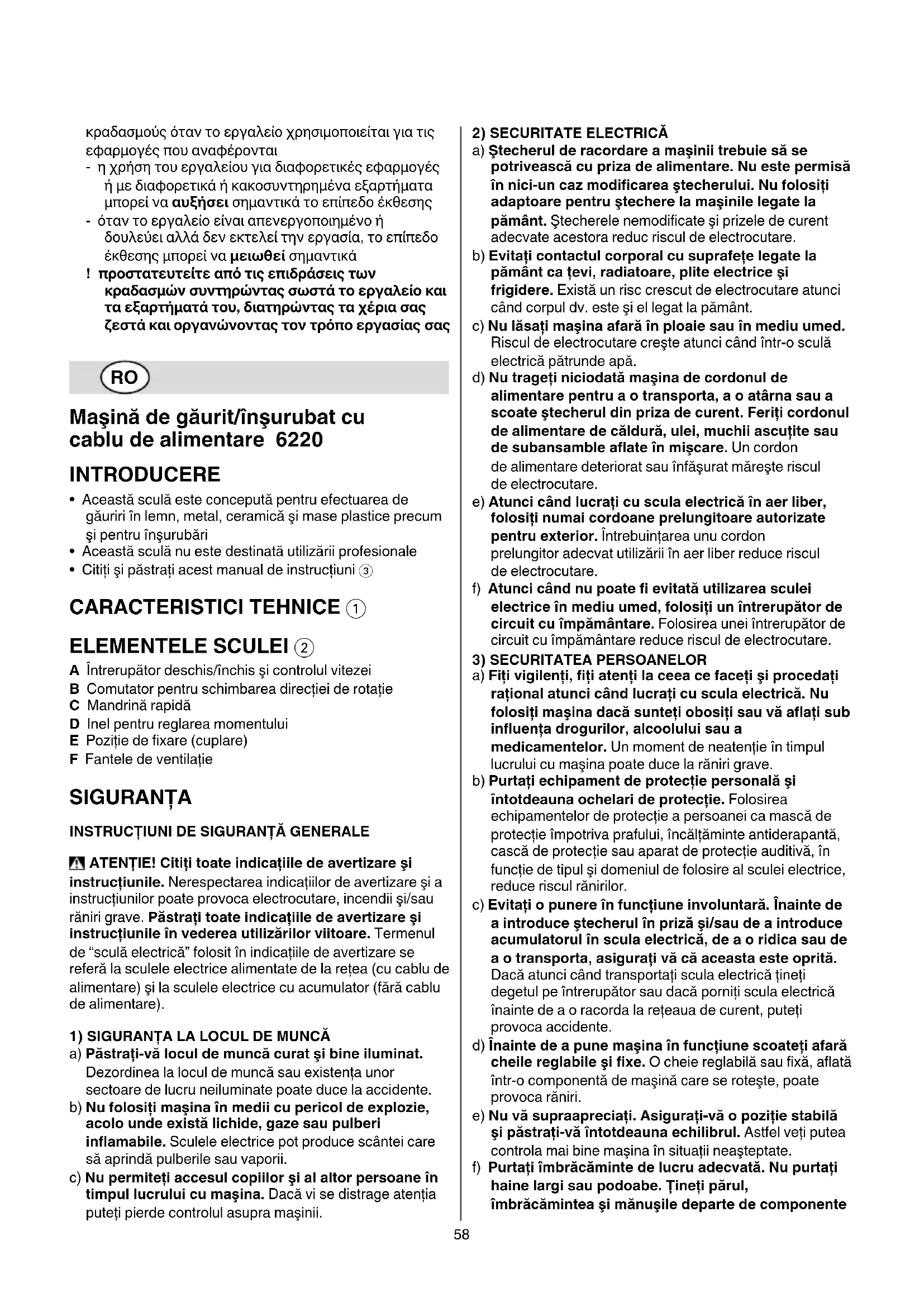 - Citiţi şi păstraţi acest manual de instrucţiuni 3 CARACTERISTICI TEHNICE 1 ELEMENTELE SCULEI 2 A Întrerupător deschis/închis şi controlul vitezei B Comutator pentru schimbarea direcţiei de rotaţie C Mandrină rapidă D Inel pentru reglarea momentului E Poziţie de fixare (cuplare) F Fantele de ventilaţie SIGURANŢA