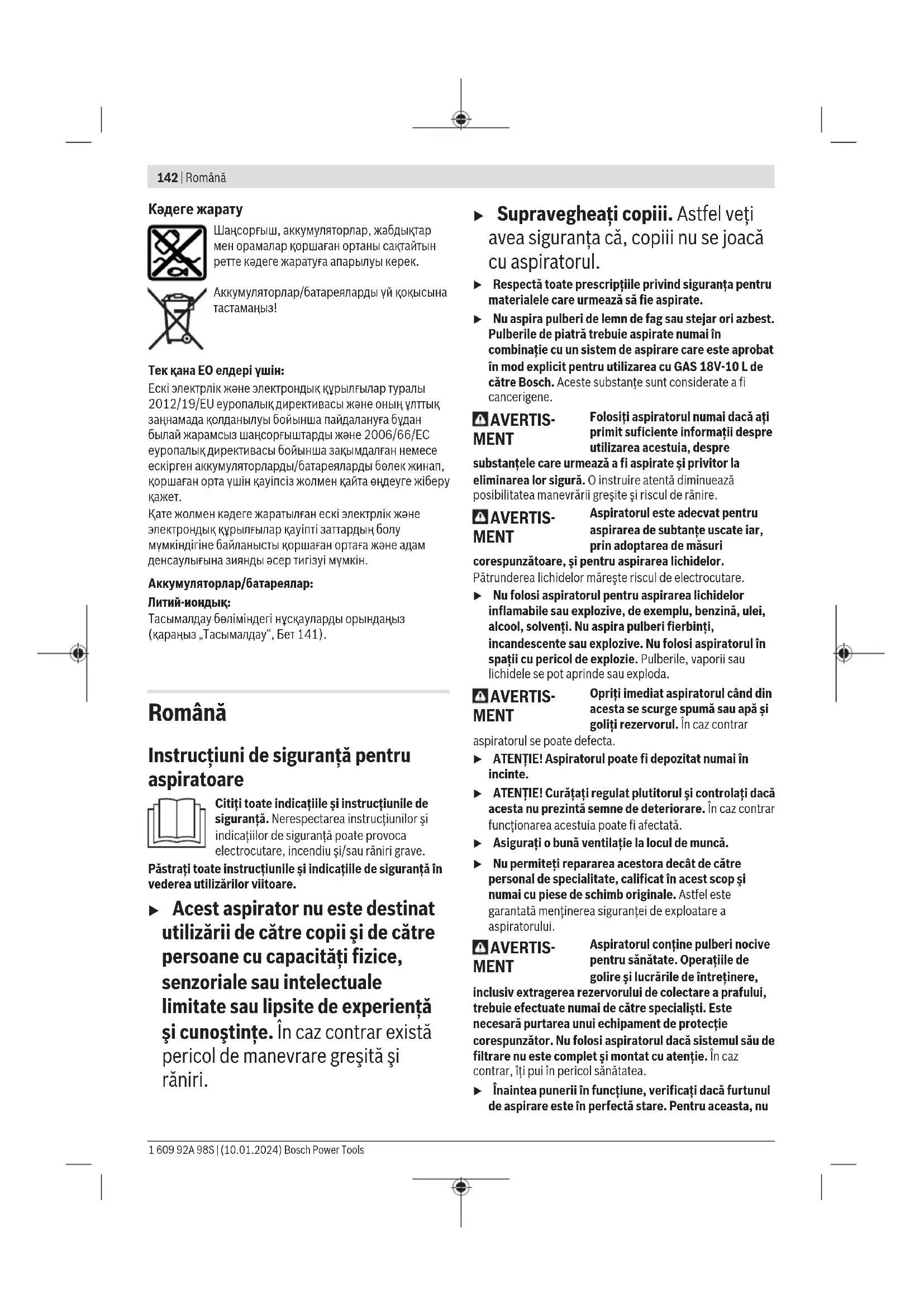 Қате жолмен кәдеге жаратылған ескі электрлік және электрондық құрылғылар қауіпті заттардың болу мүмкіндігіне байланысты қоршаған ортаға және адам денсаулығына зиянды әсер тигізуі мүмкін. Аккумуляторлар/батареялар: Литий-иондық: Тасымалдау бөліміндегі нұсқауларды орындаңыз (қараңыз „Тасымалдау“, Бет141). Română Instrucțiuni de siguranță pentru aspiratoare Citiţi toate indicaţiile şi instrucţiunile de siguranţă. Nerespectarea instrucţiunilor şi indicaţiilor de siguranţă poate provoca electrocutare, incendiu şi/sau răniri grave. Păstraţi toate instrucţiunile şi indicaţiile de siguranţă în vederea utilizărilor viitoare. u Acest aspirator nu este destinat utilizării de către copii şi de către persoane cu capacităţi fizice, senzoriale sau intelectuale limitate sau lipsite de experienţă şi cunoştinţe. În caz contrar există pericol de manevrare greşită şi răniri. u Supravegheaţi copiii. Astfel veţi avea siguranţa că, copiii nu se joacă cu aspiratorul. u Respectă toate prescripţiile privind siguranţa pentru materialele care urmează să fie aspirate. u Nu aspira pulberi de lemn de fag sau stejar ori azbest. Pulberile de piatră trebuie aspirate numai în combinaţie cu un sistem de aspirare care este aprobat în mod explicit pentru utilizarea cuGAS 18V-10 L de către Bosch. Aceste substanţe sunt considerate a fi cancerigene. AVERTIS- MENT Folosiţi aspiratorul numai dacă aţi primit suficiente informaţii despre utilizarea acestuia, despre substanţele care urmează a fi aspirate şi privitor la eliminarea lor sigură. O instruire atentă diminuează posibilitatea manevrării greşite şi riscul de rănire. AVERTIS- MENT Aspiratorul este adecvat pentru aspirarea de subtanţe uscate iar, prin adoptarea de măsuri corespunzătoare, şi pentru aspirarea lichidelor. Pătrunderea lichidelor măreşte riscul de electrocutare. u Nu folosi aspiratorul pentru aspirarea lichidelor inflamabile sau explozive, de exemplu, benzină, ulei, alcool, solvenţi. Nu aspira pulberi fierbinţi, incandescente sau explozive. Nu folosi aspiratorul în spaţii cu pericol de explozie. Pulberile, vaporii sau lichidele se pot aprinde sau exploda. AVERTIS- MENT Opriţi imediat aspiratorul când din acesta se scurge spumă sau apă şi goliţi rezervorul. În caz contrar aspiratorul se poate defecta. u ATENŢIE! Aspiratorul poate fi depozitat numai în incinte. u ATENŢIE! Curăţaţi regulat plutitorul şi controlaţi dacă acesta nu prezintă semne de deteriorare. În caz contrar funcţionarea acestuia poate fi afectată. u Asiguraţi o bună ventilaţie la locul de muncă.u Nu permiteţi repararea acestora decât de către personal de specialitate, calificat în acest scop şi numai cu piese de schimb originale. Astfel este garantată menţinerea siguranţei de exploatare a aspiratorului. AVERTIS- MENT Aspiratorul conţine pulberi nocive pentru sănătate. Operaţiile de golire şi lucrările de întreţinere, inclusiv extragerea rezervorului de colectare a prafului, trebuie efectuate numai de către specialişti. Este necesară purtarea unui echipament de protecţie corespunzător. Nu folosi aspiratorul dacă sistemul său de filtrare nu este complet şi montat cu atenţie. În caz contrar, îţi pui în pericol sănătatea. u Înaintea punerii în funcţiune, verificaţi dacă furtunul de aspirare este în perfectă stare. Pentru aceasta, nu 1 609 92A 98S | (10.01.2024) Bosch Power ToolsRomână | 143 lăsaţi furtunul de aspirare montat la aspirator pentru a nu permite evacuarea accidentală a prafului din acesta. În caz contrar aţi putea inhala acest praf. u Nu curăţaţi aspiratorul punându-l direct sub jetul de apă. Pătrunderea apei în partea superioară a aspiratorului măreşte riscul de electrocutare. u Nu deschideţi acumulatorul. Există pericol de scurtcircuit. u În cazul deteriorării sau utilizării necorespunzătoare a acumulatorului, se pot degaja vapori. Acumulatorul poate arde sau exploda. Aerisiţi bine încăperea şi solicitaţi asistenţă medicală dacă starea dumneavoastră de sănătate se înrăutăţeşte. Vaporii pot irita căile respiratorii. u În cazul utilizării necorespunzătoare sau al unui acumulator deteriorat, din acumulator se poate scurge lichid inflamabil. Evitaţi contactul cu acesta. În cazul contactului accidental, clătiţi bine cu apă. Dacă lichidul vă intră în ochi, consultaţi de asemenea un medic. Lichidul scurs din acumulator poate cauza iritaţii ale pielii sau arsuri. u În urma contactului cu obiecte ascuţite ca de exemplu cuie sau şurubelniţe sau prin acţiunea unor forţe exterioare asupra sa, acumulatorul se poate deteriora. Se poate produce un scurtcircuit intern în urma căruia acumulatorul să se aprindă, să scoată fum, să explodeze sau să se supraîncălzească. u Feriţi acumulatorii nefolosiţi de agrafele de birou, monede, chei, cuie, şuruburi sau alte obiecte metalice mici, care ar putea provoca şuntarea contactelor. Un scurtcircuit între contactele acumulatorului poate duce la arsuri sau incendiu. u Utilizează acumulatorul numai la produsele producătorului. Numai astfel acumulatorul va fi protejat împotriva unei suprasolicitări periculoase. u Încărcaţi acumulatorii numai cu încărcătoare recomandate de către producător. Un încărcător recomandat pentru acumulatori de un anumit tip poate lua foc atunci când este folosit pentru încărcarea altor acumulatori decât cei prevăzuţi pentru acesta. Feriţi acumulatorul de căldură, de asemenea, de exemplu, de radiaţii solare continue, foc, murdărie, apă şi umezeală. În caz contrar, există pericolul de explozie şi scurtcircuit. u Nu lucra cu aspiratorul da