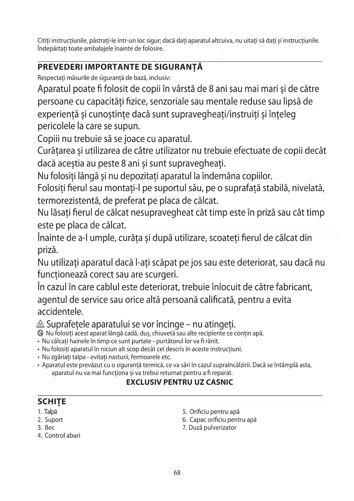 Respectaţi măsurile de siguranţă de bază, inclusiv: Aparatul poate folosit de copii în vârstă de 8 ani sau mai mari și de către persoane cu capacități zice, senzoriale sau mentale reduse sau lipsă de experiență și cunoștințe dacă sunt supravegheați/instruiți și înțeleg pericolele la care se supun. Copiii nu trebuie să se joace cu aparatul. Curățarea și utilizarea de către utilizator nu trebuie efectuate de copii decât dacă aceștia au peste 8 ani și sunt supravegheați. Nu folosiţi lângă şi nu depozitaţi aparatul la îndemâna copiilor. Folosiți erul sau montați-l pe suportul său, pe o suprafață stabilă, nivelată, termorezistentă, de preferat pe placa de călcat. Nu lăsați erul de călcat nesupravegheat cât timp este în priză sau cât timp este pe placa de călcat. Înainte de a-l umple, curăța și după utilizare, scoateți erul de călcat din priză. Nu utilizați aparatul dacă l-ați scăpat pe jos sau este deteriorat, sau dacă nu funcționează corect sau are scurgeri. În cazul în care cablul este deteriorat, trebuie înlocuit de către fabricant, agentul de service sau orice altă persoană calicată, pentru a evita accidentele. h Suprafețele aparatului se vor încinge – nu atingeți. b Nu folosiţi acest aparat lângă cadă, duş, chiuvetă sau alte recipiente ce conţin apă.