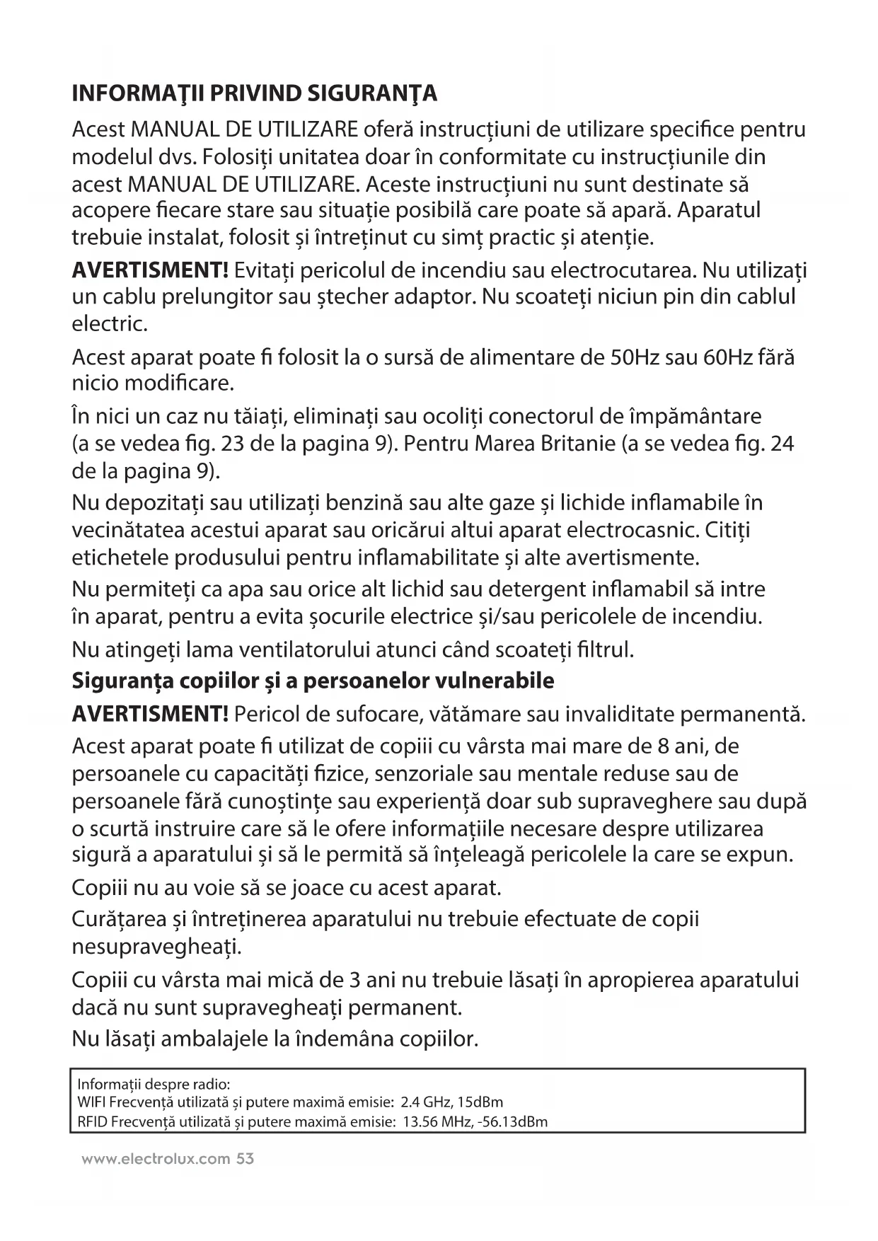 Acest MANUAL DE UTILIZARE oferă instrucțiuni de utilizare specice pentru modelul dvs. Folosiți unitatea doar în conformitate cu instrucțiunile din acest MANUAL DE UTILIZARE. Aceste instrucțiuni nu sunt destinate să acopere ecare stare sau situație posibilă care poate să apară. Aparatul trebuie instalat, folosit și întreținut cu simț practic și atenție. AVERTISMENT! Evitați pericolul de incendiu sau electrocutarea. Nu utilizați un cablu prelungitor sau ștecher adaptor. Nu scoateți niciun pin din cablul electric. Acest aparat poate folosit la o sursă de alimentare de 50Hz sau 60Hz fără nicio modicare. În nici un caz nu tăiați, eliminați sau ocoliți conectorul de împământare (ase vedea g. 23 de la pagina 9). Pentru Marea Britanie (a se vedea g. 24 de la pagina 9). Nu depozitați sau utilizați benzină sau alte gaze și lichide inamabile în vecinătatea acestui aparat sau oricărui altui aparat electrocasnic. Citiți etichetele produsului pentru inamabilitate și alte avertismente. Nu permiteți ca apa sau orice alt lichid sau detergent inamabil să intre înaparat, pentru a evita șocurile electrice și/sau pericolele de incendiu. Nu atingeți lama ventilatorului atunci când scoateți ltrul. Siguranța copiilor și a persoanelor vulnerabile AVERTISMENT! Pericol de sufocare, vătămare sau invaliditate permanentă. Acest aparat poate utilizat de copiii cu vârsta mai mare de 8 ani, de persoanele cu capacități zice, senzoriale sau mentale reduse sau de persoanele fără cunoștințe sau experiență doar sub supraveghere sau după o scurtă instruire care să le ofere informațiile necesare despre utilizarea sigură a aparatului și să le permită să înțeleagă pericolele la care se expun. Copiii nu au voie să se joace cu acest aparat. Curățarea și întreținerea aparatului nu trebuie efectuate de copii nesupravegheați. Copiii cu vârsta mai mică de 3 ani nu trebuie lăsați în apropierea aparatului dacă nu sunt supravegheați permanent. Nu lăsați ambalajele la îndemâna copiilor. Informații despre radio: WIFI Frecvență utilizată și putere maximă emisie: 2.4 GHz, 15dBm RFID Frecvență utilizată și putere maximă emisie: 13.56 MHz, -56.13dBmwww.electrolux.com54 Informații privind alimentarea electrică AVERTISMENT! Evitați pericolul de incendiu sauelectrocutarea. Dacă nu sunteți siguri că priza este împământată corespunzător sau că este protejată de o siguranță cu temporizator sau întrerupător, apelați la un tehnician calicat, care să instaleze o priză adecvată conform standardelor naționale privind instalațiile electrice șiacodurilor și a regulamentelor locale în vigoare. Nu utilizați un cablu prelungitor sau ștecher adaptor. Nu deconectați niciodată unitatea trăgând de cablul electric. Prindeți întotdeauna ștecherul ferm și trageți-l afară din priză. Nu apăsați, îndoiți sau înnodați cablul electric. Nu tăiați sau deteriorați cablul electric. În cazul în care cablul electric este deteriorat, acesta trebuie înlocuit doar la un service autorizat Electrolux. Acest aparat nu conține piese care pot reparate de utilizator. Apelați întotdeauna la un service Electrolux autorizat pentru reparații. Dacă e deteriorat cablul de alimentare, acesta trebuie înlocuit de către producător, de agentul de service al acestuia sau de o persoană calicată corespunzător, pentru a se evita pericolele. Scoateți din priză unitatea înainte de a o curăța, pentru aevita electrocutarea sau pericolele de incendiu. ROMÂNĂ Vă mulțumim pentru că ați ales puricatorul de aer Electrolux PURE A9-40/PURE A9-60. Pentru cele mai bune rezultate, folosiți întotdeauna accesorii și piese de schimb originale. Acest produs este conceput luând în calcul protecția mediului. Toate piesele din plastic sunt marcate în scopul reciclării.