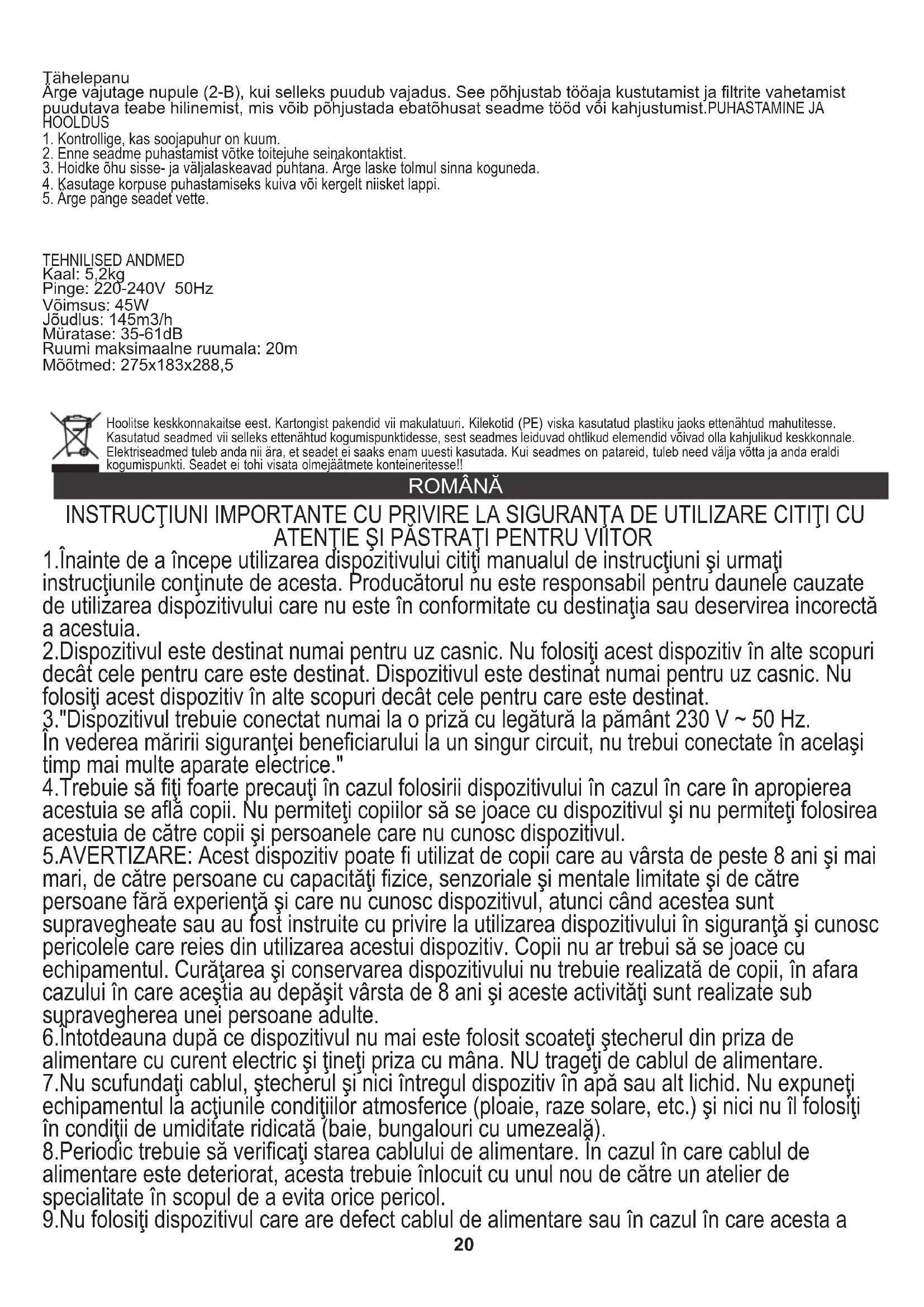 TEHNILISED ANDMED Kaal: 5,2kg Pinge: 220-240V 50Hz Võimsus: 45W Jõudlus: 145m3/h Müratase: 35-61dB Ruumi maksimaalne ruumala: 20m Mõõtmed: 275x183x288,5 ROMÂNĂ Hoolitse keskkonnakaitse eest. Kartongist pakendid vii makulatuuri. Kilekotid (PE) viska kasutatud plastiku jaoks ettenähtud mahutitesse. Kasutatud seadmed vii selleks ettenähtud kogumispunktidesse, sest seadmes leiduvad ohtlikud elemendid võivad olla kahjulikud keskkonnale. Elektriseadmed tuleb anda nii ära, et seadet ei saaks enam uuesti kasutada. Kui seadmes on patareid, tuleb need välja võtta ja anda eraldi kogumispunkti. Seadet ei tohi visata olmejäätmete konteineritesse!! INSTRUCŢIUNI IMPORTANTE CU PRIVIRE LA SIGURANŢA DE UTILIZARE CITIŢI CU ATENŢIE ŞI PĂSTRAŢI PENTRU VIITOR 1.Înainte de a începe utilizarea dispozitivului citiţi manualul de instrucţiuni şi urmaţi instrucţiunile conţinute de acesta. Producătorul nu este responsabil pentru daunele cauzate de utilizarea dispozitivului care nu este în conformitate cu destinaţia sau deservirea incorectă a acestuia. 2.Dispozitivul este destinat numai pentru uz casnic. Nu folosiţi acest dispozitiv în alte scopuri decât cele pentru care este destinat. Dispozitivul este destinat numai pentru uz casnic. Nu folosiţi acest dispozitiv în alte scopuri decât cele pentru care este destinat. 3."Dispozitivul trebuie conectat numai la o priză cu legătură la pământ 230 V ~ 50 Hz. În vederea măririi siguranţei beneficiarului la un singur circuit, nu trebui conectate în acelaşi timp mai multe aparate electrice." 4.Trebuie să fiţi foarte precauţi în cazul folosirii dispozitivului în cazul în care în apropierea acestuia se află copii. Nu permiteţi copiilor să se joace cu dispozitivul şi nu permiteţi folosirea acestuia de către copii şi persoanele care nu cunosc dispozitivul. 5.AVERTIZARE: Acest dispozitiv poate fi utilizat de copii care au vârsta de peste 8 ani şi mai mari, de către persoane cu capacităţi fizice, senzoriale şi mentale limitate şi de către persoane fără experienţă şi care nu cunosc dispozitivul, atunci când acestea sunt supravegheate sau au fost instruite cu privire la utilizarea dispozitivului în siguranţă şi cunosc pericolele care reies din utilizarea acestui dispozitiv. Copii nu ar trebui să se joace cu echipamentul. Curăţarea şi conservarea dispozitivului nu trebuie realizată de copii, în afara cazului în care aceştia au depăşit vârsta de 8 ani şi aceste activităţi sunt realizate sub supravegherea unei persoane adulte. 6.Întotdeauna după ce dispozitivul nu mai este folosit scoateţi ştecherul din priza de alimentare cu curent electric şi ţineţi priza cu mâna. NU trageţi de cablul de alimentare. 7.Nu scufundaţi cablul, ştecherul şi nici întregul dispozitiv în apă sau alt lichid. Nu expuneţi echipamentul la acţiunile condiţiilor atmosferice (ploaie, raze solare, etc.) şi nici nu îl folosiţi în condiţii de umiditate ridicată (baie, bungalouri cu umezeală). 8.Periodic trebuie să verificaţi starea cablului de alimentare. În cazul în care cablul de alimentare este deteriorat, acesta trebuie înlocuit cu unul nou de către un atelier de specialitate în scopul de a evita orice pericol. 9.Nu folosiţi dispozitivul care are defect cablul de alimentare sau în cazul în care acesta a
