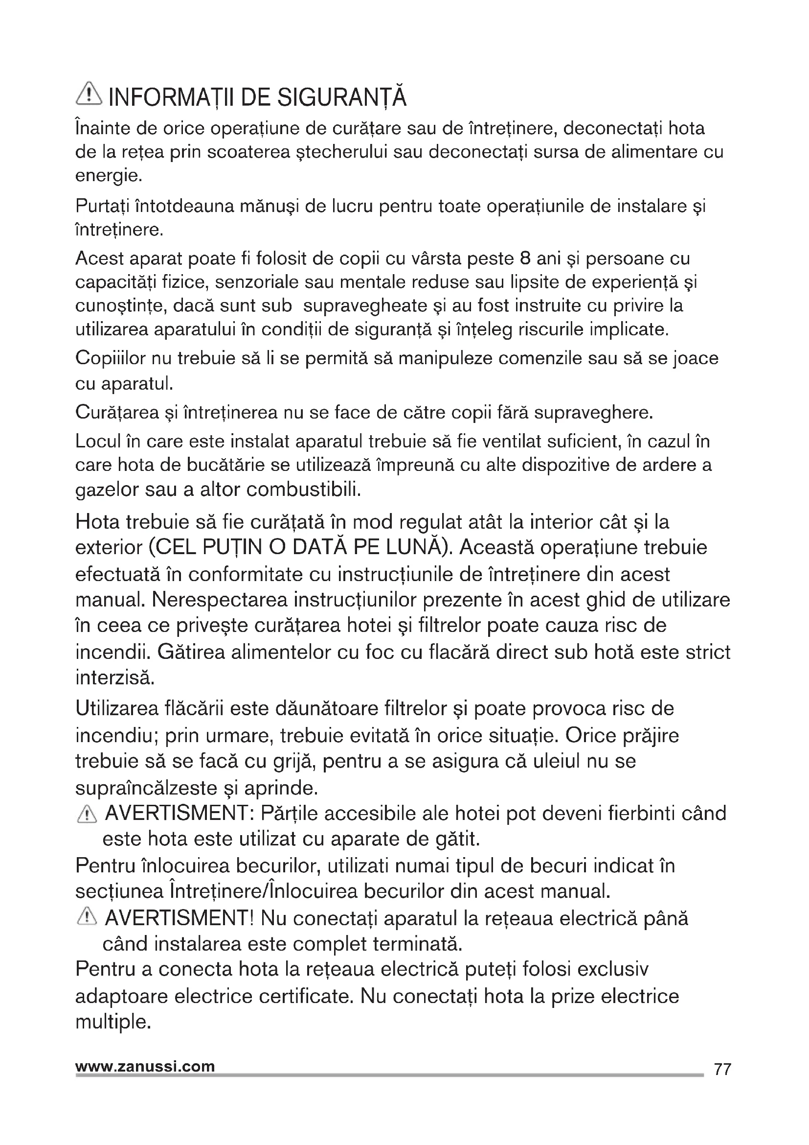 Înainte de orice operaţiune de curăţare sau de întreţinere, deconectaţi hota de la reţea prin scoaterea ştecherului sau deconectaţi sursa de alimentare cu energie. Purtaţi întotdeauna mănuşi de lucru pentru toate operaţiunile de instalare şi întreţinere. Acest aparat poate fi folosit de copii cu vârsta peste 8 ani şi persoane cu capacităţi fizice, senzoriale sau mentale reduse sau lipsite de experienţă şi cunoştinţe, dacă sunt sub supravegheate şi au fost instruite cu privire la utilizarea aparatului în condiţii de siguranţă şi înţeleg riscurile implicate. Copiiilor nu trebuie să li se permită să manipuleze comenzile sau să se joace cu aparatul. Curăţarea şi întreţinerea nu se face de către copii fără supraveghere. Locul în care este instalat aparatul trebuie să fie ventilat suficient, în cazul în care hota de bucătărie se utilizează împreună cu alte dispozitive de ardere a gazelor sau a altor combustibili. Hota trebuie să fie curăţată în mod regulat atât la interior cât şi la exterior (CEL PUŢIN O DATĂ PE LUNĂ). Această operaţiune trebuie efectuată în conformitate cu instrucţiunile de întreţinere din acest manual. Nerespectarea instrucţiunilor prezente în acest ghid de utilizare în ceea ce priveşte curăţarea hotei şi filtrelor poate cauza risc de incendii. Gătirea alimentelor cu foc cu flacără direct sub hotă este strict interzisă. Utilizarea flăcării este dăunătoare filtrelor şi poate provoca risc de incendiu; prin urmare, trebuie evitată în orice situaţie. Orice prăjire trebuie să se facă cu grijă, pentru a se asigura că uleiul nu se supraîncălzeste şi aprinde. AVERTISMENT: Părţile accesibile ale hotei pot deveni fierbinti când este hota este utilizat cu aparate de gătit. Pentru înlocuirea becurilor, utilizati numai tipul de becuri indicat în secţiunea Întreţinere/Înlocuirea becurilor din acest manual. AVERTISMENT! Nu conectaţi aparatul la reţeaua electrică până când instalarea este complet terminată. Pentru a conecta hota la rețeaua electrică puteți folosi exclusiv adaptoare electrice certificate. Nu conectați hota la prize electrice multiple.78 www.zanussi.com