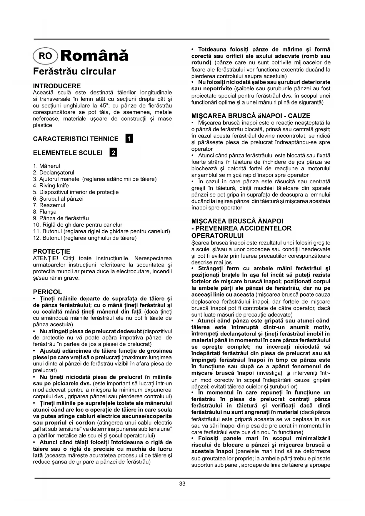 - Mişcarea bruscă înapoi este o reacţie neaşteptată la o pânză de ferăstrău blocată, prinsă sau centrată greşit; în cazul acesta ferăstrăul devine necontrolat, se ridică şi părăseşte piesa de prelucrat îndreaptându-se spre operator