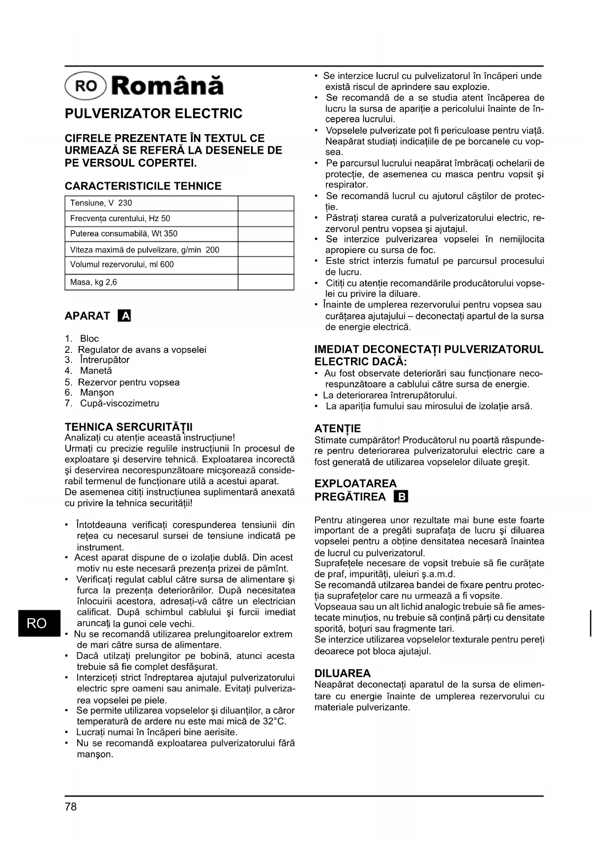 Stimate cumpărător! Producătorul nu poartă răspundere pentru deteriorarea pulverizatorului electric care a fost generată de utilizarea vopselelor diluate greșit.