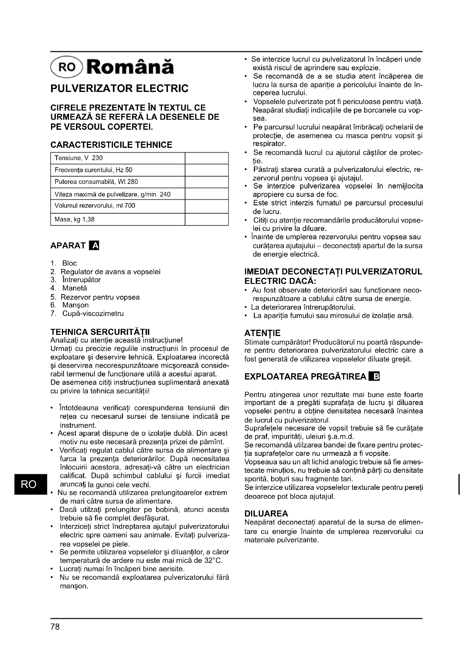 Pentru atingerea unor rezultate mai bune este foarte important de a pregăti suprafaţa de lucru şi diluarea vopselei pentru a obţine densitatea necesară înaintea de lucrul cu pulverizatorul. Suprafeţele necesare de vopsit trebuie să fi e curăţate de praf, impurităţi, uleiuri ş.a.m.d. Se recomandă utilzarea bandei de fi xare pentru protec- ţia suprafeţelor care nu urmează a fi vopsite. Vopseaua sau un alt lichid analogic trebuie să fi e ames- tecate minuţios, nu trebuie să conţină părţi cu densitate sporită, boţuri sau fragmente tari. Se interzice utilizarea vopselelor texturale pentru pereţi deoarece pot bloca ajutajul. DILUAREA Neapărat deconectaţi aparatul de la sursa de elimen- tare cu energie înainte de umplerea rezervorului cu materiale pulverizante.79