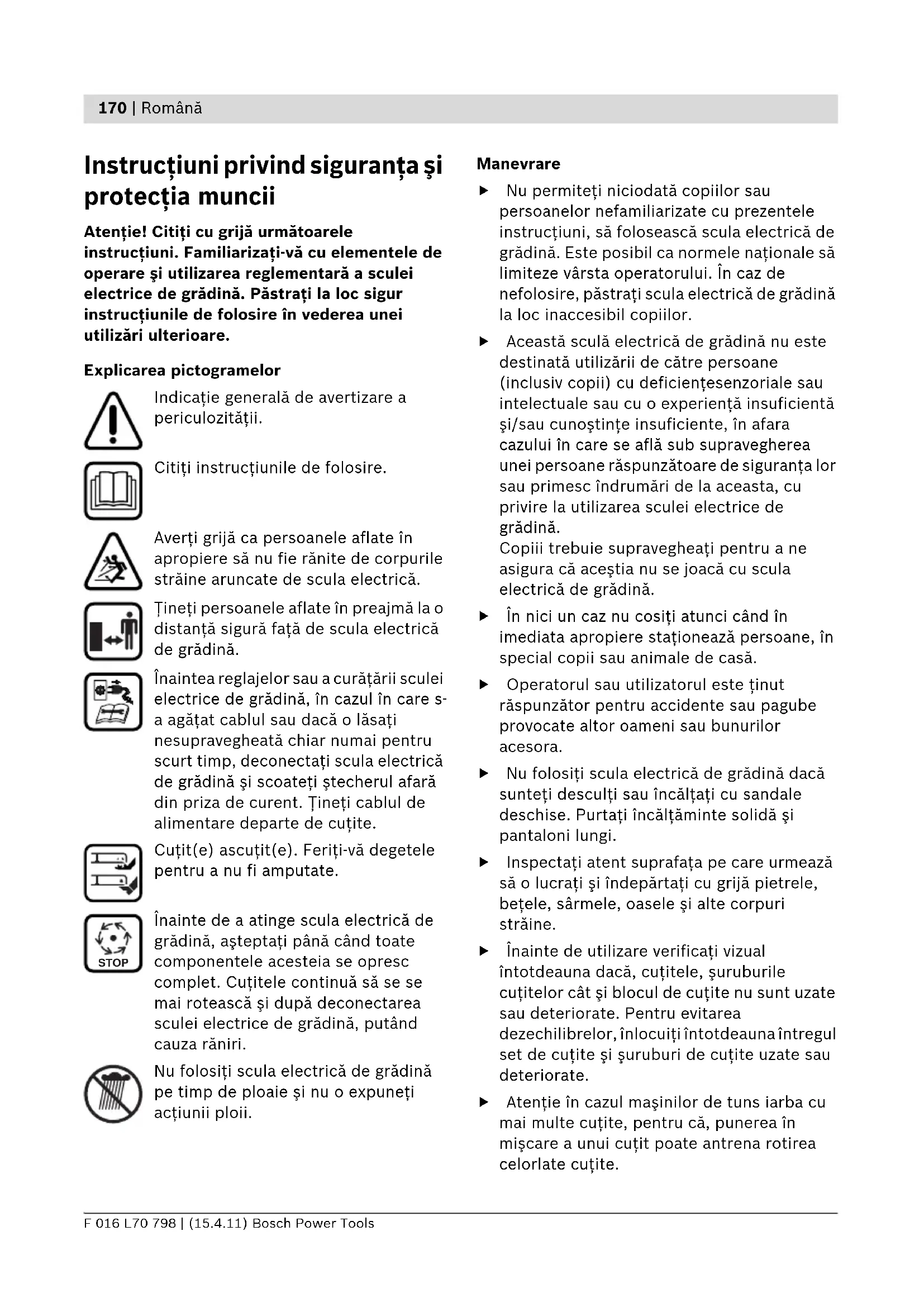 Instrucţiuni privind siguranţa şi protecţia muncii Atenţie! Citiţi cu grijă următoarele instrucţiuni. Familiarizaţi-vă cu elementele de operare şi utilizarea reglementară a sculei electrice de grădină. Păstraţi la loc sigur instrucţiunile de folosire în vederea unei utilizări ulterioare. Explicarea pictogramelor Indicaţie generală de avertizare a periculozităţii. Citiţi instrucţiunile de folosire. Averţi grijă ca persoanele aflate în apropiere să nu fie rănite de corpurile străine aruncate de scula electrică. Ţineţi persoanele aflate în preajmă la o distanţă sigură faţă de scula electrică de grădină. Înaintea reglajelor sau a curăţării sculei electrice de grădină, în cazul în care s- a agăţat cablul sau dacă o lăsaţi nesupravegheată chiar numai pentru scurt timp, deconectaţi scula electrică de grădină şi scoateţi ştecherul afară din priza de curent. Ţineţi cablul de alimentare departe de cuţite. Cuţit(e) ascuţit(e). Feriţi-vă degetele pentru a nu fi amputate. Înainte de a atinge scula electrică de grădină, aşteptaţi până când toate componentele acesteia se opresc complet. Cuţitele continuă să se se mai rotească şi după deconectarea sculei electrice de grădină, putând cauza răniri. Nu folosiţi scula electrică de grădină pe timp de ploaie şi nu o expuneţi acţiunii ploii. Manevrare f Nu permiteţi niciodată copiilor sau persoanelor nefamiliarizate cu prezentele instrucţiuni, să folosească scula electrică de grădină. Este posibil ca normele naţionale să limiteze vârsta operatorului. În caz de nefolosire, păstraţi scula electrică de grădină la loc inaccesibil copiilor. f Această sculă electrică de grădină nu este destinată utilizării de către persoane (inclusiv copii) cu deficienţesenzoriale sau intelectuale sau cu o experienţă insuficientă şi/sau cunoştinţe insuficiente, în afara cazului în care se află sub supravegherea unei persoane răspunzătoare de siguranţa lor sau primesc îndrumări de la aceasta, cu privire la utilizarea sculei electrice de grădină. Copiii trebuie supravegheaţi pentru a ne asigura că aceştia nu se joacă cu scula electrică de grădină. f În nici un caz nu cosiţi atunci când în imediata apropiere staţionează persoane, în special copii sau animale de casă. f Operatorul sau utilizatorul este ţinut răspunzător pentru accidente sau pagube provocate altor oameni sau bunurilor acesora. f Nu folosiţi scula electrică de grădină dacă sunteţi desculţi sau încălţaţi cu sandale deschise. Purtaţi încălţăminte solidă şi pantaloni lungi. f Inspectaţi atent suprafaţa pe care urmează să o lucraţi şi îndepărtaţi cu grijă pietrele, beţele, sârmele, oasele şi alte corpuri străine. f Înainte de utilizare verificaţi vizual întotdeauna dacă, cuţitele, şuruburile cuţitelor cât şi blocul de cuţite nu sunt uzate sau deteriorate. Pentru evitarea dezechilibrelor, înlocuiţi întotdeauna întregul set de cuţite şi şuruburi de cuţite uzate sau deteriorate. f Atenţie în cazul maşinilor de tuns iarba cu mai multe cuţite, pentru că, punerea în mişcare a unui cuţit poate antrena rotirea celorlate cuţite. STOP OBJ_BUCH-1393-001.book Page 170 Friday, April 15, 2011 10:36 AMRomână | 171 Bosch Power Tools F 016 L70 798 | (15.4.11) f Cosiţi numai la lumina zilei sau la lumină artificială bună. f Pe cât posibil nu folosiţi scula electrică de grădină la tunderea ierbii ude. f Păşiţi întotdeauna încet, nu alergaţi niciodată repede. f Cosirea ierbii pe taluzuri poate fi periculoasă. – Nu cosiţi în pantă foarte abruptă. – Fiţi întotdeauna atenţi, astfel încât să păşiţi în siguranţă pe suprafeţele înclinate sau pe iarba udă. – Pe suprafeţele înclinate cosiţi întotdeauna transversal şi niciodată în sus şi în jos. – La schimbarea direcţiei în pante fiţi extrem de precauţi. – Fiţi extrem de precauţi atunci când mergeţi înapoi cu scula electrică de grădină sau o trageţi spre dumneavoastră. – În timpul cosirii împingeţi scula electrică de grădină întotdeauna spre înainte şi nu o trageţi niciodată în direcţia corpului dumneavoastră. f Cuţitele trebuie să se afle în repaus, atunci când sunteţi nevoiţi să răsturnaţi scula electrică de grădină în vederea transportului, când traversaţi suprafeţe neplantate cu iarbă şi când transportaţi scula electrică spre şi de la sectorul de cosit. f Nu răsturnaţi scula electrică de grădină în momentul pornirii motorului sau al demarării, în afara cazului în care motorul trebuie pornit în iarbă înaltă. În acest caz, ridicaţi, nu mai mult decât este necesar, partea opusă operatorului, împingând în jos mâneul. Aveţi grijă să ţineţi mâinile pe mâner atunci când lăsaţi din nou jos scula electrică de gădină. f Porniţi scula electrică de grădină conform celor descrise în instrucţiunile de folosire şi aveţi grijă să vă ţineţi picioarele departe de componentele care se rotesc. f Nu ţineţi mâinile şi picioareţe în apropierea sau sub piesele care se rotesc. f Păstraţi o distanţă sigură faţă de zona de aruncare a materialului tocat în timpul lucrului cu scula electrică de grădină. f Nu ridicaţi respectiv nu transportaţi scula electrică de grădină cu motorul pornit. f Nu folosiţi în niciun caz scula electrică de grădină în cazul în care aceasta prezintă dispozitive de protecţie, capace defecte sau echipamente de siguranţă care lipsesc, ca de exemplu bara de protecţie sau coşul colector de iarbă. f Fiţi extrem de precauţi atunci când efectuaţi operaţii de reglare la maşina de tuns iarba pentru a evita prinderea mâinilor şi picioarelor între cuţitele mobile şi componentele fixe ale maşinii de tuns iarba. f Ţineţi cablurile de alimentare şi prelungitoarele departe de cuţit. Cuţitul poate de