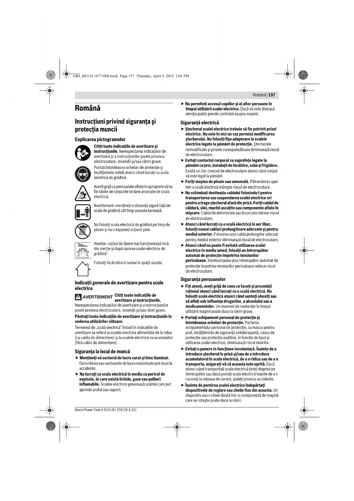 Бұл литий-иондық аккумуляторлар қауіпті тауарларға қойылатын талаптарға сай болуы керек. Пайдаланушы аккумуляторларды көшеде қосымша құжаттарсыз тасымалдай алады. Үшінші тұлғалар (мысалы, әуе көлігі немесе жіберу) орамаға және маркаларға қойылатын арнайы талаптарды сақтау керек. Жіберуге дайындау кезінде қауіпті жүктер маманына хабарласу керек. Кәдеге жарату Бақ электрбұйымдарын, қосымша бөлшектер мен қорапшаларды қоршаған ортаға зиян келдірмейтін кәдеге жарату қажет. Бақ электрбұйымдарын, электр оталдырғыштары мен аккумуляторларын/батареяларын тұрмыстық қалдықтар контейнеріне салмаңыз! Тек қана ЕО елдері үшін: Еуропалық 2012/19/EU директивасына сәйкес, қолдануға жарамсыз электр және электроника бұйымдары мен құралдары, және 2006/66/EC директивасына сай, бұзылған немесе қолдануға жарамсыз ескі аккумуляторлар/батареялар бөлек іріктеліп жиналып, қоршаған ортаға зиян келтірмей қайта қолдану үшін өңделуге тапсырылуы қажет. Ішіне құрастырылып салынған аккумуляторларды электр бұйымнан тек қана кәдеге жарату үшін шығарып алуға болады. Тұрқы қаптауын ашу арқылы бақ электр бұйымның бұзылып қалуы мүмкін. Аккумуляторды электр құралынан шығару үшін қосқыш/өшіргішті аккумулятор толық зарядсызданғанша басыңыз. Корпустағы бұрандаларды бұрап шығарып, аккумуляторды шығару үшін корпус қаптамасын алып қойыңыз. Қысқа тұйықталудың алдын алу үшін аккумулятордағы қоспаларды бірінен соң бірін ажыратып сосын полюстерді оқшауландырыңыз. Толық зарядсызданған болса да аккумуляторде аз қуат қалып қысқа тұйықталуда іске қосылуы мүмкін. Аккумуляторлар/батареялар: Li-ион: «Тасымалдау» тарауындағы нұсқауларына назар аударыңыз. Техникалық өзгерістер енгізу құқығы сақталады. OBJ_BUCH-1077-008.book Page 156 Thursday, April 9, 2015 2:01 PMRomână | 157 Bosch Power Tools F 016 L81 250 | (9.4.15) Română Instrucţiuni privind siguranţa şi protecţia muncii Explicarea pictogramelor Citiţi toate indicaţiile de avertizare şi instrucţiunile. Nerespectarea indicaţiilor de avertizare şi a instrucţiunilor poate provoca electrocutare, incendii şi/sau răniri grave. Purtaţi întotdeauna ochelari de protecţie şi încălţăminte solidă atunci când lucraţi cu scula electrică de grădină. Averţi grijă ca persoanele aflate în apropiere să nu fie rănite de corpurile străine aruncate de scula electrică. Avertisment: menţineţi o distanţă sigură faţă de scula de grădină cât timp aceasta lucrează. Nu folosiţi scula electrică de grădină pe timp de ploaie şi nu o expuneţi acţiunii ploii. Atenţie: cuţitul de tăiere mai funcţionează încă din inerţie şi după oprirea sculei electrice de grădină! Folosiţi încărcătorul numai în spaţii uscate. Indicaţii generale de avertizare pentru scule electrice Citiţi toate indicaţiile de avertizare şi instrucţiunile. Nerespectarea indicaţiilor de avertizare şi a instrucţiunilor poate provoca electrocutare, incendii şi/sau răniri grave. Păstraţi toate indicaţiile de avertizare şi instrucţiunile în vederea utilizărilor viitoare. Termenul de „sculă electrică“ folosit în indicaţiile de avertizare se referă la sculele electrice alimentate de la reţea (cu cablu de alimentare) şi la sculele electrice cu acumulator (fără cablu de alimentare). Siguranţa la locul de muncă Menţineţi-vă sectorul de lucru curat şi bine iluminat. Dezordinea sau sectoarele de lucru neluminate pot duce la accidente. Nu lucraţi cu scula electrică în mediu cu pericol de explozie, în care există lichide, gaze sau pulberi inflamabile. Sculele electrice generează scântei care pot aprinde praful sau vaporii. Nu permiteţi accesul copiilor şi al altor persoane în timpul utilizării sculei electrice. Dacă vă este distrasă atenţia puteţi pierde controlul asupra maşinii. Siguranţă electrică Ştecherul sculei electrice trebuie să fie potrivit prizei electrice. Nu este în nici un caz permisă modificarea ştecherului. Nu folosiţi fişe adaptoare la sculele electrice legate la pământ de protecţie. Ştecherele nemodificate şi prizele corespunzătoare diminuează riscul de electrocutare. Evitaţi contactul corporal cu suprafeţe legate la pământ ca ţevi, instalaţii de încălzire, sobe şi frigidere. Există un risc crescut de electrocutare atunci când corpul vă este legat la pământ. Feriţi maşina de ploaie sau umezeală. Pătrunderea apei într-o sculă electrică măreşte riscul de electrocutare. Nu schimbaţi destinaţia cablului folosindu-l pentru transportarea sau suspendarea sculei electrice ori pentru a trage ştecherul afar