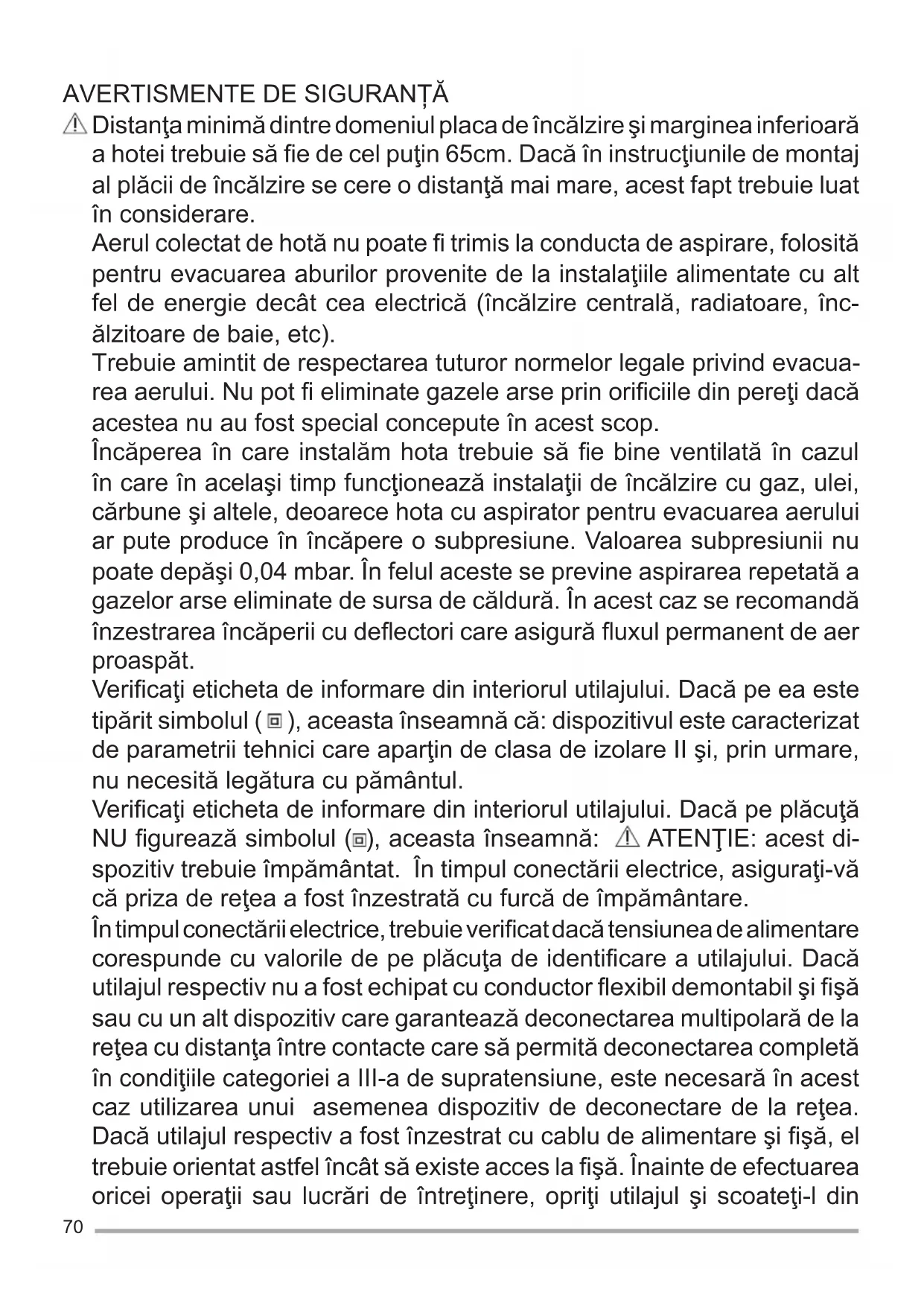 Distanţa minimă dintre domeniul placa de încălzire şi marginea inferioară a hotei trebuie să fi e de cel puţin 65cm. Dacă în instrucţiunile de montaj al plăcii de încălzire se cere o distanţă mai mare, acest fapt trebuie luat în considerare. Aerul colectat de hotă nu poate fi trimis la conducta de aspirare, folosită pentru evacuarea aburilor provenite de la instalaţiile alimentate cu alt fel de energie decât cea electrică (încălzire centrală, radiatoare, înc- ălzitoare de baie, etc). Trebuie amintit de respectarea tuturor normelor legale privind evacua- rea aerului. Nu pot fi eliminate gazele arse prin orifi ciile din pereţi dacă acestea nu au fost special concepute în acest scop. Încăperea în care instalăm hota trebuie să fi e bine ventilată în cazul în care în acelaşi timp funcţionează instalaţii de încălzire cu gaz, ulei, cărbune şi altele, deoarece hota cu aspirator pentru evacuarea aerului ar pute produce în încăpere o subpresiune. Valoarea subpresiunii nu poate depăşi 0,04 mbar. În felul aceste se previne aspirarea repetată a gazelor arse eliminate de sursa de căldură. În acest caz se recomandă înzestrarea încăperii cu defl ectori care asigură fl uxul permanent de aer proaspăt. Verifi caţi eticheta de informare din interiorul utilajului. Dacă pe ea este tipărit simbolul ( ), aceasta înseamnă că: dispozitivul este caracterizat de parametrii tehnici care aparţin de clasa de izolare II şi, prin urmare, nu necesită legătura cu pământul. Verifi caţi eticheta de informare din interiorul utilajului. Dacă pe plăcuţă NU fi gurează simbolul ( ), aceasta înseamnă: ATENŢIE: acest di- spozitiv trebuie împământat. În timpul conectării electrice, asiguraţi-vă că priza de reţea a fost înzestrată cu furcă de împământare. În timpul conectării electrice, trebuie verifi cat dacă tensiunea de alimentare corespunde cu valorile de pe plăcuţa de identifi care a utilajului. Dacă utilajul respectiv nu a fost echipat cu conductor fl exibil demontabil şi fi şă sau cu un alt dispozitiv care garantează deconectarea multipolară de la reţea cu distanţa între contacte care să permită deconectarea completă în condiţiile categoriei a III-a de supratensiune, este necesară în acest caz utilizarea unui asemenea dispozitiv de deconectare de la reţea. Dacă utilajul respectiv a fost înzestrat cu cablu de alimentare şi fi şă, el trebuie orientat astfel încât să existe acces la fi şă. Înainte de efectuarea oricei operaţii sau lucrări de întreţinere, opriţi utilajul şi scoateţi-l din71 priza de alimentare. Dacг cablul de alimentare s-a deteriorat, acesta trebuie оnlocuit de cгtre producгtor, de cгtre biroul sгu de asistenюг tehnicг sau de cгtre o persoanг cu o califi care similarг pentru a putea astfel preveni orice risc. Atenюie: Imposibilitatea de a instala єuruburi sau elemente de fi xare оn conformitate cu aceste instrucюiuni poate duce la pericole electrice. Instalarea se va face conform prezentelor instrucюiuni, numai de per- soane califi cate. Trebuie evitată folosirea materialelor infl amabile în apropierea utilajului. În timpul pregătirii preparatelor culinare aveţi grijă să nu ajungă fl acăra la hotă. În cazul prăjirii pe tigaie, aveţi grije ca uleiul sau grăsimea să nu ia foc. Deoasebit de periculos din cauza infl amabilităţii sale este uleiul. Nu folosiţi grătare electric deschise. În scopul evitării riscului de incendiu, trebuie respectate întotdeauna instrucţiunile în timpul curăţarii fi ltrelor de grăsime şi înlăturării eventua- lelor depuneri de grăsime de pe utilaj. Utilajul poate fi folosit de persoanele cu dezabilităţi fi zice, senzoriale sau mentale reduse , sau care nu posedă destulă experienţă sau cunoştinţe, cu condiţ ia că aceste persoane se afl ă sub control, au primit instrucţiunile de deservire şi înţeleg pericolele aferente. Se interzice folosirea utilajului în jocul copiilor. Curăţarea şi lucrările de întreţinere care trebuie efectuate de utilizator nu pot fi executate de copiii nesupravegheaţi. Atenţie: părţile de la suprafaţa hotelor pot fi fi erbinţi când sunt întreb- uinţate împreună cu alte utilaje de bucătărie. Această hotă poate fi utilizată numai în condiţii casnice şi este destinată pentru instalare deasupra maşinilor de gătit, aparatelor de gătit şi altor echipamente similare.72 afectatг єi funcюionarea acestora. Filtru de cărbune de lemn nu este potrivit pentru curățare și nu poate fi reînnoit și trebuie înlocuit aproximativ la fi ecare 4 luni de utilizare sau mai des în caz de utilizare deosebit de intensă. UTILIZAREA FILTRANTГ SAU ASPIRANTГ ? Hota poate fi utilizatг atвt оn versiune fi ltrantг cвt єi оn versiune aspirantг. Decideюi de la оnceput versiunea de instalare. Pentru o mai bunг efi cienюг, vг recomandгm sг instalaюi hota оn versiunea aspirantг (dacг este posibil). Versiune aspirantг Hota fi ltreazг aerul єi-l оmpinge оn exterior printr-o conductг de evacuare. Versiune fi ltrantг Hota fi ltreazг aerul єi-l reintroduce curat оn camerг. ÎNTREŢINEREA O intreţinere corespunzatoare va asigura funcţion- area corectă şi îndelungată a utilajului. Curăţirea de grăsime a aparatului trebuie efectuată periodic, în funcţie de intensitatea utilizării (cel puţin odată la trei luni). Evitaţi folosirea de produse care conţin sunstanţe corozive, abrazive. Pentru curăţarea părţilor utilajului acoperite la exterior cu lac, se foloseşte o cârpă înmuiată în apă călduţă şi detergent neutru. Pentru curăţarea din exterior a elementelor din oţel, cupru sau bronz, trebuie folosite întotdeauna produse adecvate, conform instrucţiunilor de utilizare a acestora. Pentru curăţarea interiorului utilajului, trebuie folosită o cârpă sau o perie umezită cu alcool denaturat. Curгюarea fi ltre