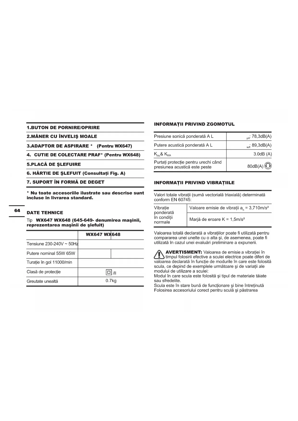 = 3,710m/s² Marjă de eroare K = 1,5m/s² Valoarea totală declarată a vibraţiilor poate utilizată pentru compararea unei unelte cu o alta şi, de asemenea, poate utilizată în cazul unei evaluări preliminare a expunerii. AVERTISMENT: Valoarea de emisie a vibraţiei în timpul folosirii efective a sculei electrice poate diferi de valoarea declarată în funcţie de modurile în care este folosită scula, ce depind de exemplele următoare şi de variaţii ale modului de utilizare a sculei: Modul în care scula este folosită şi tipul de materiale tăiate sau sfredelite. Scula este în stare bună de funcţionare şi bine întreţinută Folosirea accesoriului corect pentru sculă şi păstrarea65 acesteia în condiţii bune. Strângerea corespunzătoare a mânerelor şi dacă se folosesc accesorii anti-vibraţie. Scula este folosită conform indicaţiilor din fabrică şi conform acestor instrucţiuni. Această sculă poate cauza sindromul vibraţie mână-braţ dacă nu este folosită în mod corespunzător. AVERTISMENT: Pentru a corectă, estimarea nivelului de expunere în condiţii concrete de folosire trebuie să ia în considerare toate părţile ciclului de operare cum ar de câte ori scula este oprită şi cât timp este pornită dar nu lucrează. Acest lucru poate reduce semnicativ nivelul de expunere de-a lungul perioadei de lucru totale. Ajută la micşorarea riscului de expunere le vibraţii. Utilizaţi ÎNTOTDEAUNA dălţi, burghie şi lame ascuţite. Păstraţi acest aparat în conformitate cu aceste instrucţiuni şi păstraţi-l bine gresat (dacă e cazul) Dacă acest aparat este folosit în mod constant, atunci cumprăaţi accesorii anti-vibraţie. Evitaţi folosirea aparaturii la temperaturi mai joase de 10°C Planicaţi-vă programul de lucru pentru a folosi sculele cu număr mare de vibraţii de-a lungul a mai multe zile. ACCESORII WX647 WX648 Hârtie de şlefuit cu arici (perforată) 6 buc. 9 buc. Hârtie de şlefuit pentru îndepărtarea vopselurilor 3 buc. 6 buc. Hârtie de şlefuit în formă de deget 3 buc. 6 buc. Suport în formă de deget 1 buc. 1 buc. Adaptor de aspirare 1 buc. / Cutie de colectare praf / 1 buc. Vă recomandăm să achiziţionaţi accesoriile de la acelaşi magazin de la care aţi cumpărat unealta. Consultaţi ambalajul accesoriului pentru detalii suplimentare. Personalul din magazin vă poate oferi asistenţă şi sfaturi.