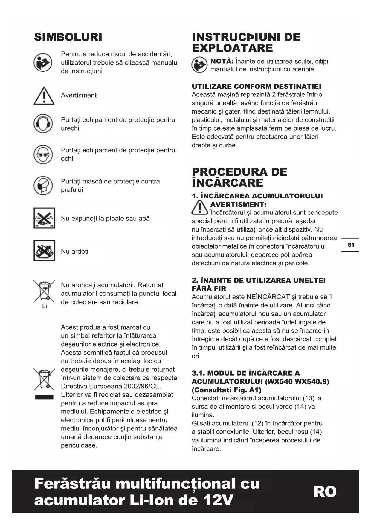 Conectaţi încărcătorul acumulatorului (13) la sursa de alimentare şi becul verde (14) va ilumina. Glisaţi acumulatorul (12) în încărcător pentru a stabili conexiunile. Ulterior, becul roşu (14) va ilumina indicând începerea procesului de încărcare. Pentru a reduce riscul de accidentări, utilizatorul trebuie să citească manualul de instrucţiuni Avertisment Purtaţi echipament de protecţie pentru urechi Purtaţi echipament de protecţie pentru ochi Purtaţi mască de protecţie contra prafului Nu expuneţi la ploaie sau apă Nu ardeţi Nu aruncaţi acumulatorii. Returnaţi acumulatorii consumaţi la punctul local de colectare sau reciclare. Acest produs a fost marcat cu un simbol referitor la înlăturarea deşeurilor electrice şi electronice. Acesta semnică faptul că produsul nu trebuie depus în acelaşi loc cu deşeurile menajere, ci trebuie returnat într-un sistem de colectare ce respectă Directiva Europeană 2002/96/CE. Ulterior va reciclat sau dezasamblat pentru a reduce impactul asupra mediului. Echipamentele electrice şi electronice pot periculoase pentru mediul înconjurător şi pentru sănătatea umană deoarece conţin substanţe periculoase.