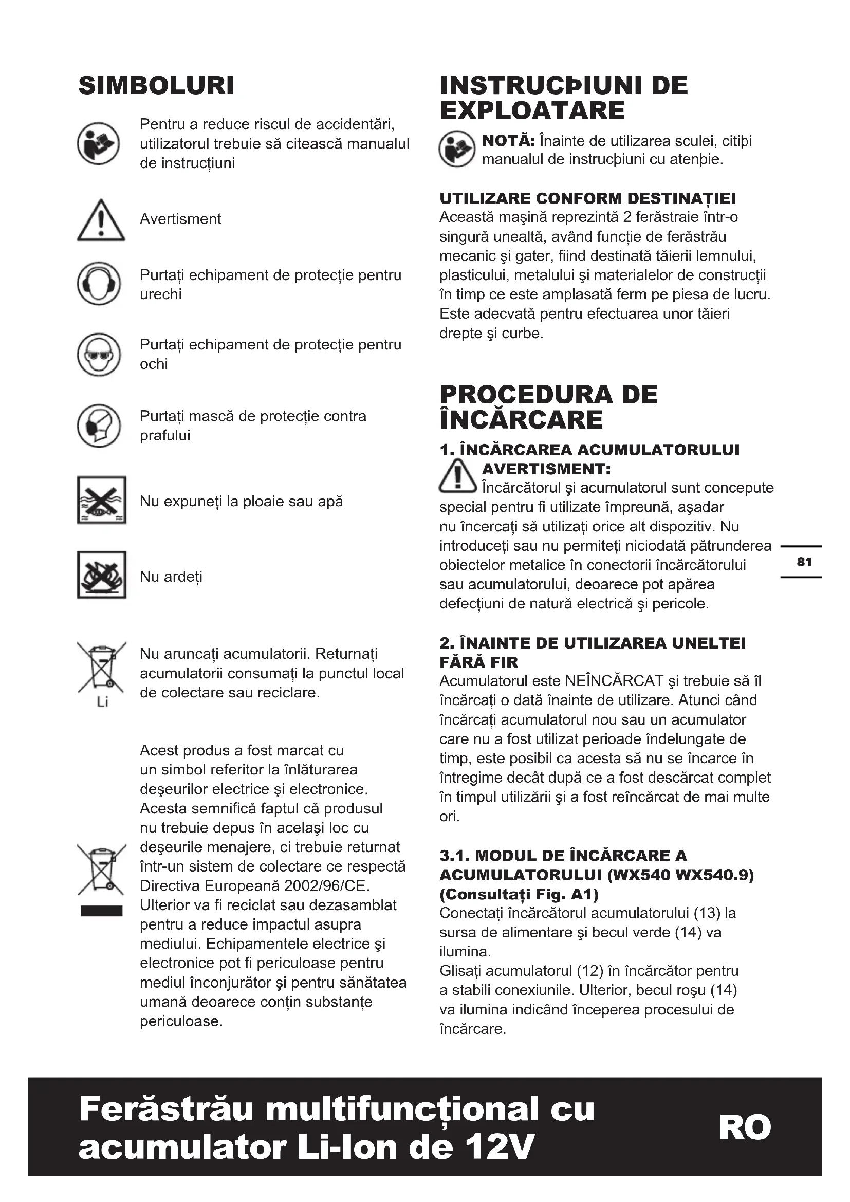 Conectaţi încărcătorul acumulatorului (13) la sursa de alimentare şi becul verde (14) va ilumina. Glisaţi acumulatorul (12) în încărcător pentru a stabili conexiunile. Ulterior, becul roşu (14) va ilumina indicând începerea procesului de încărcare. Pentru a reduce riscul de accidentări, utilizatorul trebuie să citească manualul de instrucţiuni Avertisment Purtaţi echipament de protecţie pentru urechi Purtaţi echipament de protecţie pentru ochi Purtaţi mască de protecţie contra prafului Nu expuneţi la ploaie sau apă Nu ardeţi Nu aruncaţi acumulatorii. Returnaţi acumulatorii consumaţi la punctul local de colectare sau reciclare. Acest produs a fost marcat cu un simbol referitor la înlăturarea deşeurilor electrice şi electronice. Acesta semnică faptul că produsul nu trebuie depus în acelaşi loc cu deşeurile menajere, ci trebuie returnat într-un sistem de colectare ce respectă Directiva Europeană 2002/96/CE. Ulterior va reciclat sau dezasamblat pentru a reduce impactul asupra mediului. Echipamentele electrice şi electronice pot periculoase pentru mediul înconjurător şi pentru sănătatea umană deoarece conţin substanţe periculoase.