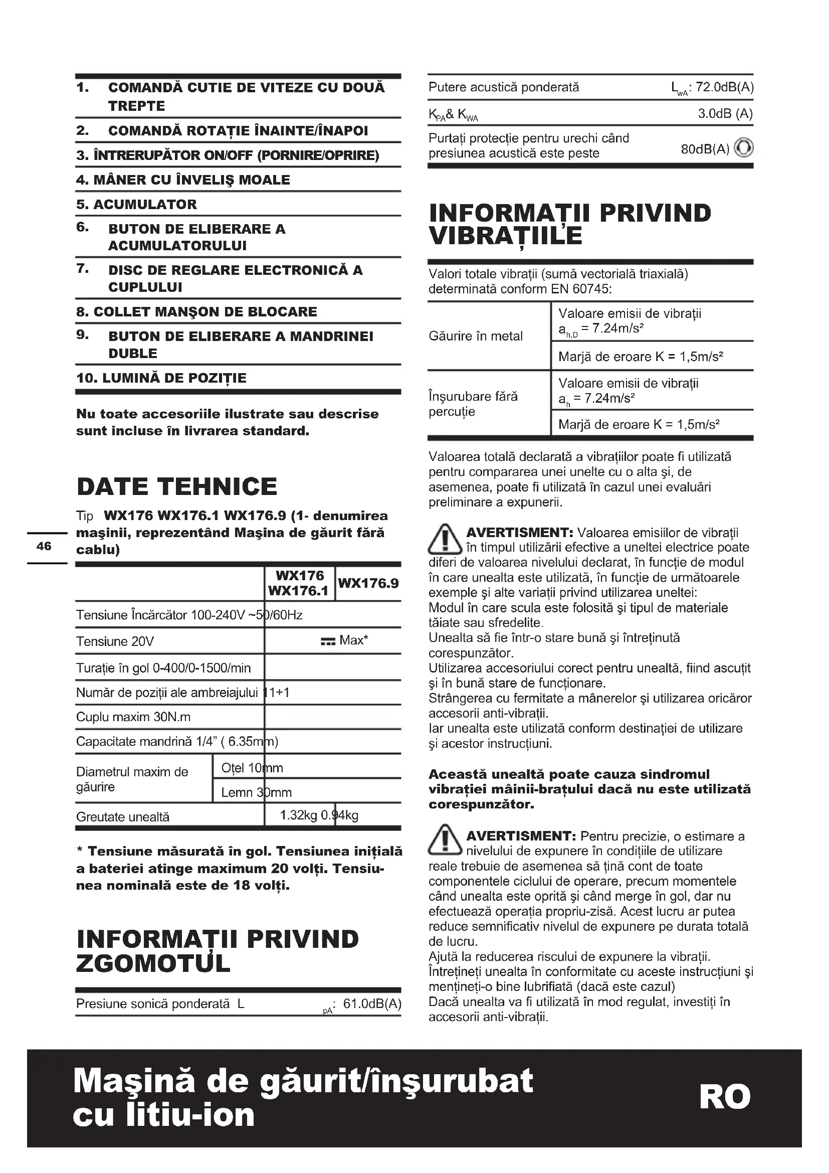 Nu toate accesoriile ilustrate sau descrise sunt incluse în livrarea standard. DATE TEHNICE Tip WX176 WX176.1 WX176.9 (1- denumirea maşinii, reprezentând Maşina de găurit fără cablu) WX176 WX176.1 WX176.9 Tensiune Încărcător 100-240V ~50/60Hz Tensiune 20V Max* Turaţie în gol 0-400/0-1500/min Număr de poziţii ale ambreiajului 11+1 Cuplu maxim 30N.m Capacitate mandrină 1/4” ( 6.35mm) Diametrul maxim de găurire Oţel 10mm Lemn 30mm Greutate unealtă 1.32kg 0.94kg