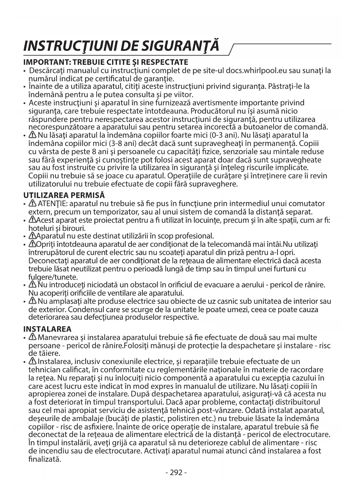 - Pentru metode detaliate de instalare, revizie, întreţinere şi reparare, descărcaţi manualul complet de pe site-ul docs.whirlpool.eu.