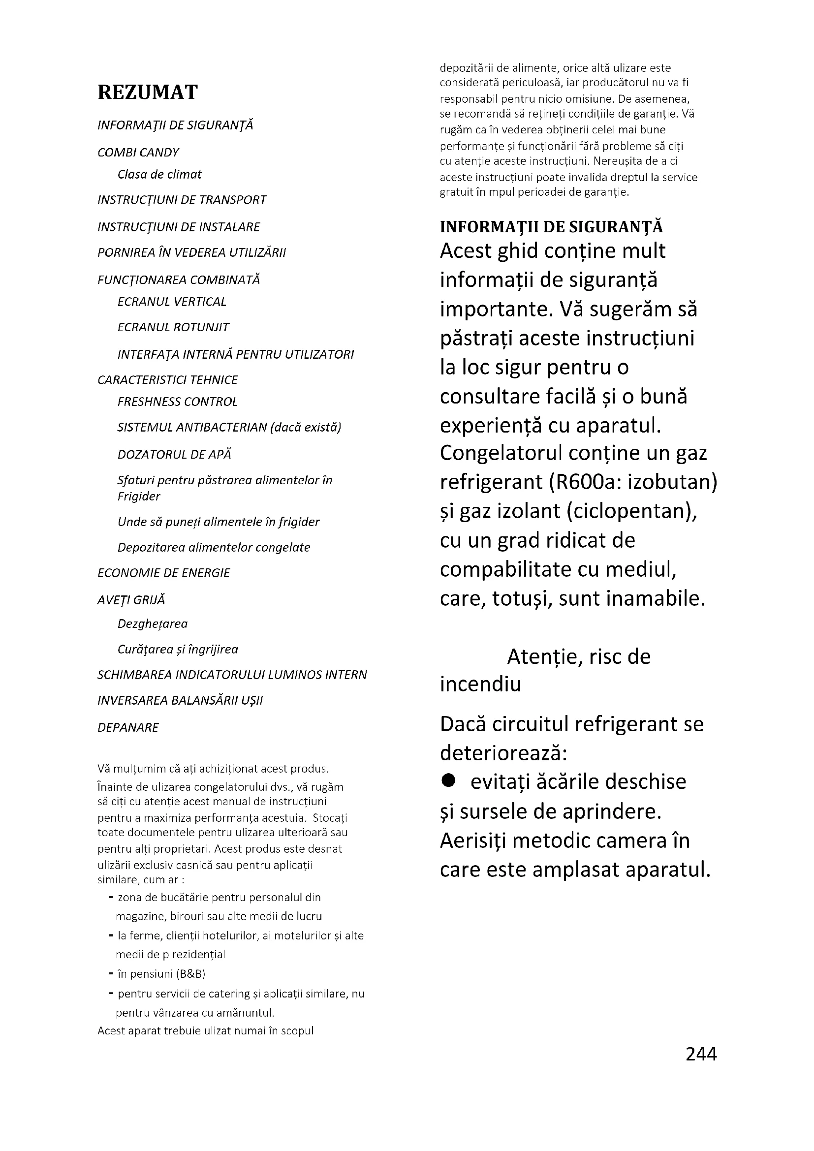 Informácia o zhode Označením tohto produktu značkou potvrdzujeme zhodu so všetkými príslušnými európskymi bezpečnostnými, zdravotnými a ekologickými požiadavkami, ktoré platia v rámci právnych predpisov pre tento produkt.244 Română REZUMAT INFORMAŢII DE SIGURANŢĂ COMBI CANDY Clasa de climat INSTRUCŢIUNI DE TRANSPORT INSTRUCŢIUNI DE INSTALARE PORNIREA ÎN VEDEREA UTILIZĂRII FUNCŢIONAREA COMBINATĂ ECRANUL VERTICAL ECRANUL ROTUNJIT INTERFAŢA INTERNĂ PENTRU UTILIZATORI CARACTERISTICI TEHNICE FRESHNESS CONTROL SISTEMUL ANTIBACTERIAN (dacă există) DOZATORUL DE APĂ Sfaturi pentru păstrarea alimentelor în Frigider Unde să puneți alimentele în frigider Depozitarea alimentelor congelate ECONOMIE DE ENERGIE AVEŢI GRIJĂ Dezghețarea Curăţarea și îngrijirea SCHIMBAREA INDICATORULUI LUMINOS INTERN INVERSAREA BALANSĂRII UȘII DEPANARE Vă mulțumim că ați achiziționat acest produs. Înainte de utilizarea congelatorului dvs., vă rugăm să citiți cu atenție acest manual de instrucțiuni pentru a maximiza performanța acestuia. Stocați toate documentele pentru utilizarea ulterioară sau pentru alți proprietari. Acest produs este destinat utilizării exclusiv casnică sau pentru aplicații similare, cum ar fi: - zona de bucătărie pentru personalul din magazine, birouri sau alte medii de lucru - la ferme, clienții hotelurilor, ai motelurilor și alte medii de tip rezidențial - în pensiuni (B&B) - pentru servicii de catering și aplicații similare, nu pentru vânzarea cu amănuntul. Acest aparat trebuie utilizat numai în scopul depozitării de alimente, orice altă utilizare este considerată periculoasă, iar producătorul nu va fi responsabil pentru nicio omisiune. De asemenea, se recomandă să rețineți condițiile de garanție. Vă rugăm ca în vederea obținerii celei mai bune performanțe și funcționării fără probleme să citiți cu atenție aceste instrucțiuni. Nereușita de a citi aceste instrucțiuni poate invalida dreptul la service gratuit în timpul perioadei de garanție.