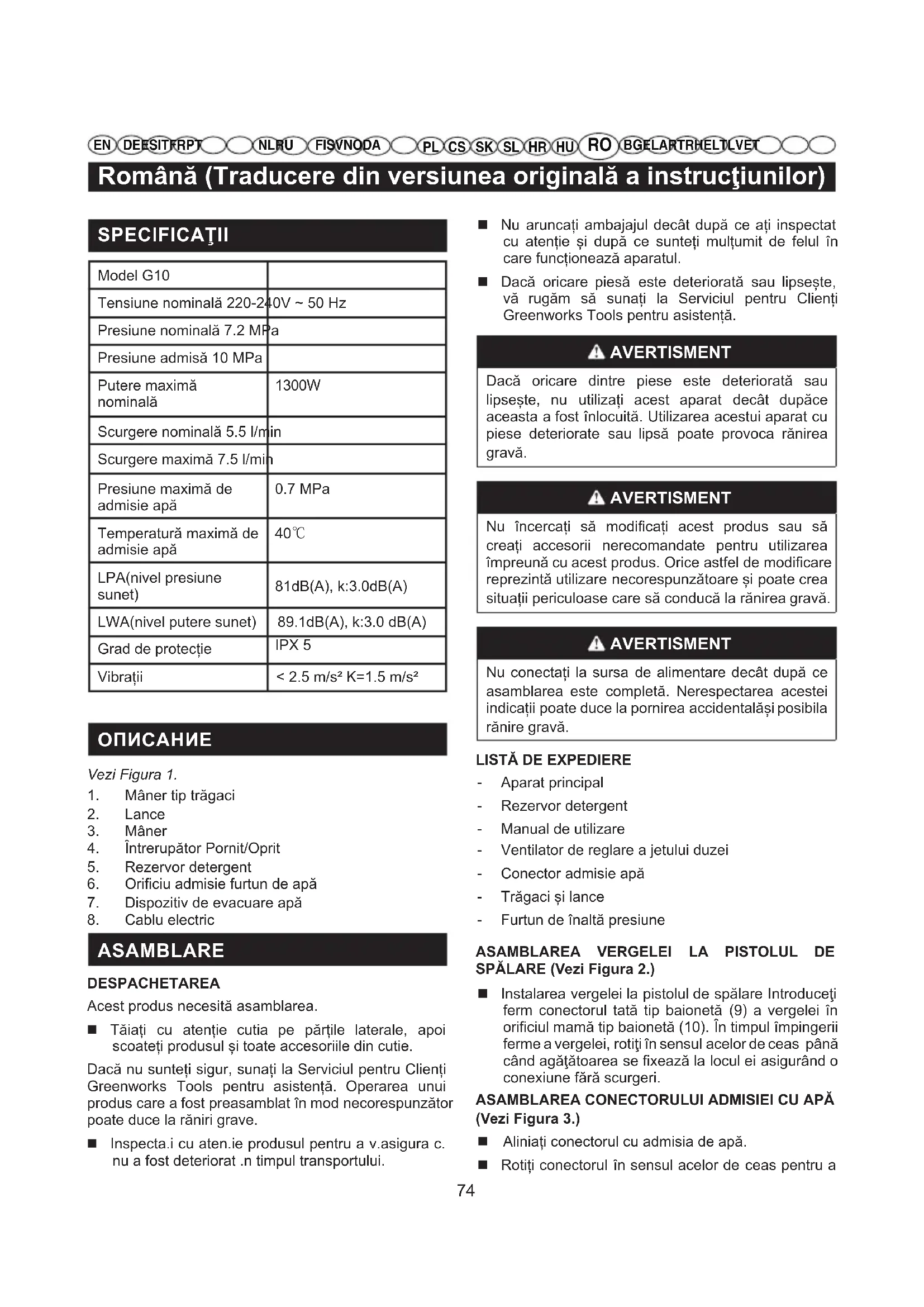 MANUAL DE UTILIZARE G10 GREENWORKS