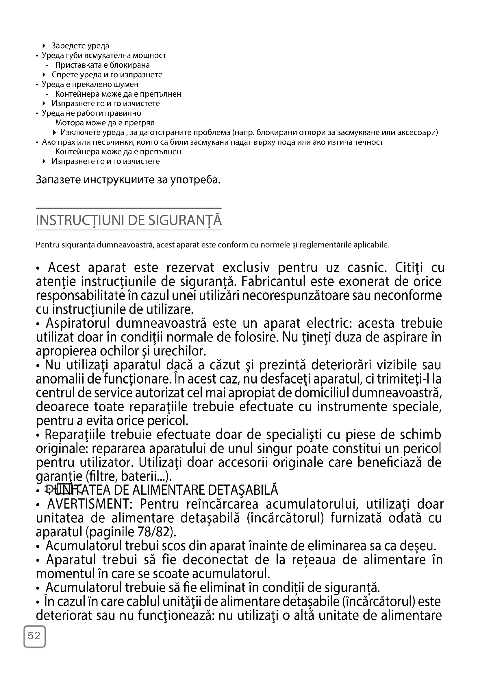 - Aparatul trebui să fie deconectat de la rețeaua de alimentare în momentul în care se scoate acumulatorul.