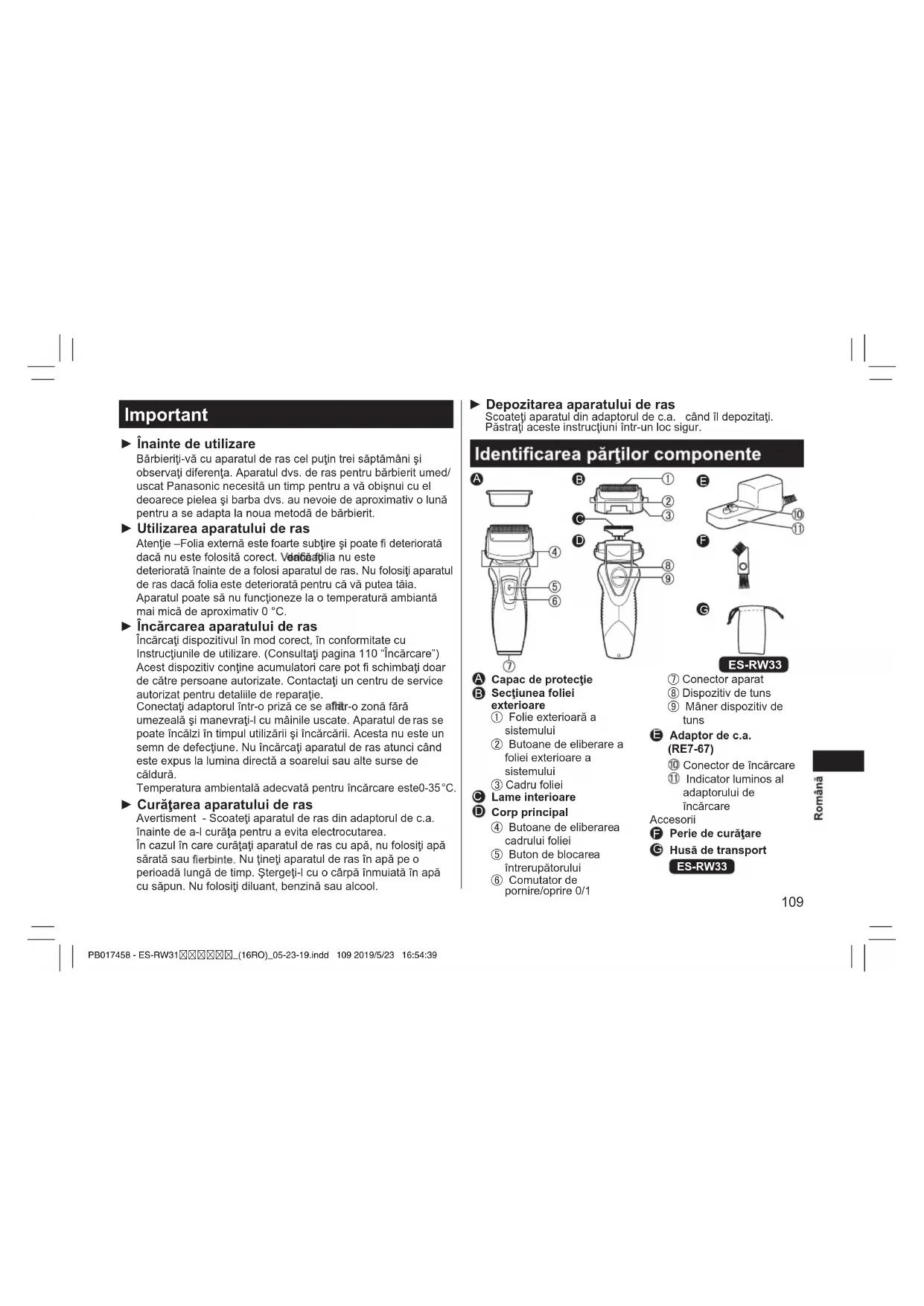- Simbolulurmătorindicăfaptulcăestenecesarăo unitatedealimentaredetaşabilăspecicăpentru conectareaaparatuluielectriclareţeauadealimentare. Referinţatipuluiunităţiidealimentareestemarcatǎ lângăsimbol. PB017458 - ES-RW31_(16RO)_05-23-19.indd 108 2019/5/23 16:54:39109 Important ► Înainte de utilizare Bărbieriţi-vă cu aparatul de ras cel puţin trei săptămâni şi observaţi diferenţa. Aparatul dvs. de ras pentru bărbierit umed/ uscat Panasonic necesită un timp pentru a vă obişnui cu el deoarece pielea şi barba dvs. au nevoie de aproximativ o lună pentru a se adapta la noua metodă de bărbierit. ► Utilizarea aparatului de ras Atenţie –Folia externă este foarte subţire şi poate deteriorată dacă nu este folosită corect. dacă folia nu este deteriorată înainte de a folosi aparatul de ras. Nu folosiţi aparatul de ras dacă folia este deteriorată pentru că vă putea tăia. Aparatul poate să nu funcţioneze la o temperatură ambiantă mai mică de aproximativ 0 °C. ► Încărcarea aparatului de ras Conectaţi adaptorul într-o priză ce se într-o zonă fǎrǎ umezeală şi manevraţi-l cu mâinile uscate. Aparatul de ras se poate încălzi în timpul utilizării şi încărcării. Acesta nu este un semn de defecţiune. Nu încărcaţi aparatul de ras atunci când este expus la lumina directă a soarelui sau alte surse de căldură. Temperatura ambientală adecvată pentru încărcare este 0-35 °C. ► Curăţarea aparatului de ras Avertisment - Scoateţi aparatul de ras din adaptorul de c.a. înainte de a-l curăţa pentru a evita electrocutarea. În cazul în care curăţaţi aparatul de ras cu apă, nu folosiţi apă sărată sau Nu ţineţi aparatul de ras în apă pe
