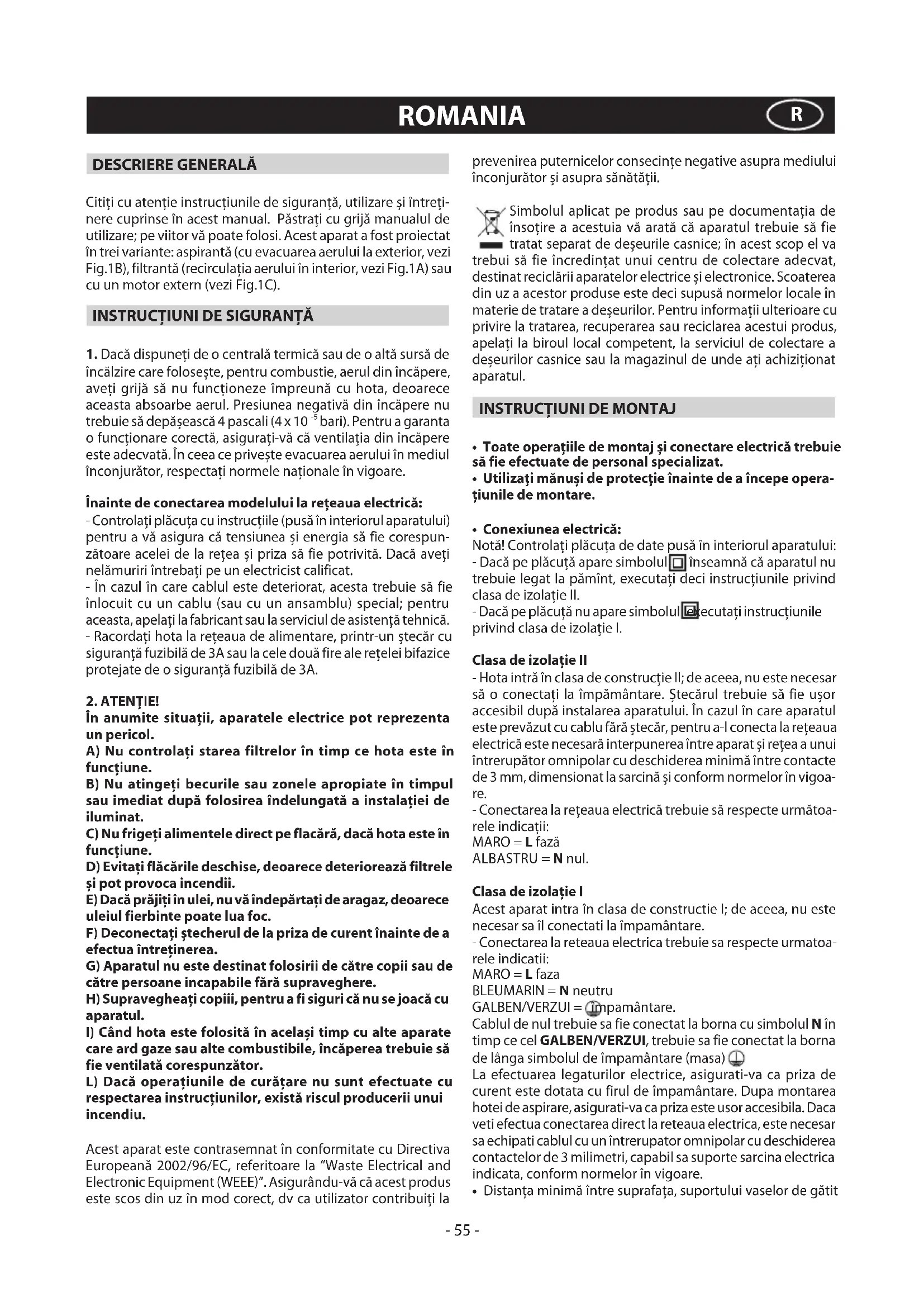 - Conexiuneaelectrică: Notă! Controlaţi plăcuţa de date pusă în interiorul aparatului: - Dacă pe plăcuţă apare simbolul înseamnă că aparatul nu trebuie legat la pămînt, executaţi deci instrucţiunile privind clasa de izolaţie II. - Dacă pe plăcuţă nu apare simbolul executaţi instrucţiunile privind clasa de izolaţie I. Clasa de izolaţie II - Hota intră în clasa de construcţie II; de aceea, nu este necesar să o conectaţi la împământare. Ştecărul trebuie să fie uşor accesibil după instalarea aparatului. În cazul în care aparatul este prevăzut cu cablu fără ştecăr, pentru a-l conecta la reţeaua electrică este necesară interpunerea între aparat şi reţea a unui întrerupător omnipolar cu deschiderea minimă între contacte de 3 mm, dimensionat la sarcină şi conform normelor în vigoa- re. - Conectarea la reţeaua electrică trebuie să respecte următoa- rele indicaţii: MARO = L fază ALBASTRU = N nul. Clasa de izolaţie I Acest aparat intra în clasa de constructie I; de aceea, nu este necesar sa îl conectati la împamântare. - Conectarea la reteaua electrica trebuie sa respecte urmatoa- rele indicatii: MARO = L faza BLEUMARIN = N neutru GALBEN/VERZUI = împamântare. Cablul de nul trebuie sa fie conectat la borna cu simbolul N în timp ce cel GALBEN/VERZUI, trebuie sa fie conectat la borna de lânga simbolul de împamântare (masa) . La efectuarea legaturilor electrice, asigurati-va ca priza de curent este dotata cu firul de împamântare. Dupa montarea hotei de aspirare, asigurati-va ca priza este usor accesibila. Daca veti efectua conectarea direct la reteaua electrica, este necesar sa echipati cablul cu un întrerupator omnipolar cu deschiderea contactelor de 3 milimetri, capabil sa suporte sarcina electrica indicata, conform normelor în vigoare.