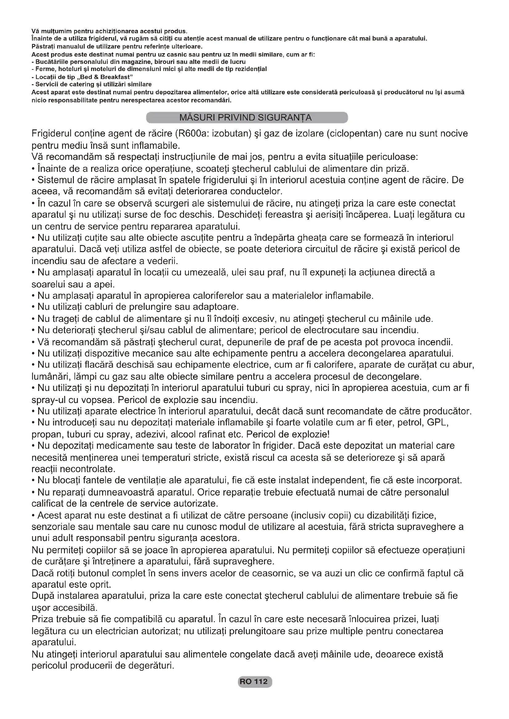 PROBLEME ÎN FUNCŢIONARE...................................... 120--120Vă mulţumim pentru achiziţionarea acestui produs. Înainte de a utiliza frigiderul, vă rugăm să citiţi cu atenţie acest manual de utilizare pentru o funcţionare cât mai bună a aparatului. Păstraţi manualul de utilizare pentru referinţe ulterioare. Acest produs este destinat numai pentru uz casnic sau pentru uz în medii similare, cum ar fi: - Bucătăriile personalului din magazine, birouri sau alte medii de lucru - Ferme, hoteluri şi moteluri de dimensiuni mici şi alte medii de tip rezidenţial - Locaţii de tip „Bed & Breakfast” - Servicii de catering şi utilizări similare Acest aparat este destinat numai pentru depozitarea alimentelor, orice altă utilizare este considerată periculoasă şi producătorul nu îşi asumă nicio responsabilitate pentru nerespectarea acestor recomandări. Frigiderul conţine agent de răcire (R600a: izobutan) şi gaz de izolare (ciclopentan) care nu sunt nocive pentru mediu însă sunt inflamabile. Vă recomandăm să respectaţi instrucţiunile de mai jos, pentru a evita situaţiile periculoase: