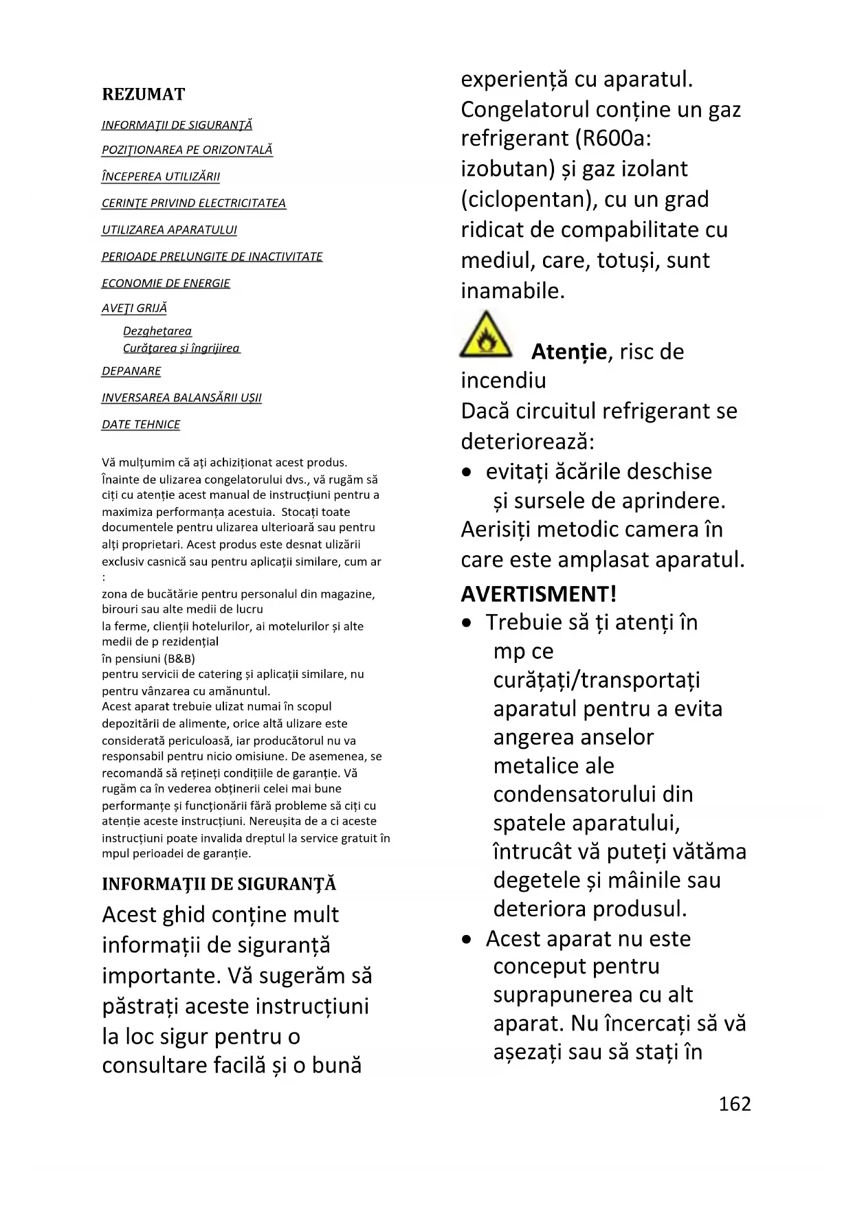 Acest ghid conține mult informații de siguranță importante. Vă sugerăm să păstrați aceste instrucțiuni la loc sigur pentru o consultare facilă și o bună experiență cu aparatul. Congelatorul conține un gaz refrigerant (R600a: izobutan) și gaz izolant (ciclopentan), cu un grad ridicat de compatibilitate cu mediul, care, totuși, sunt inflamabile. Atenție, risc de incendiu Dacă circuitul refrigerant se deteriorează: