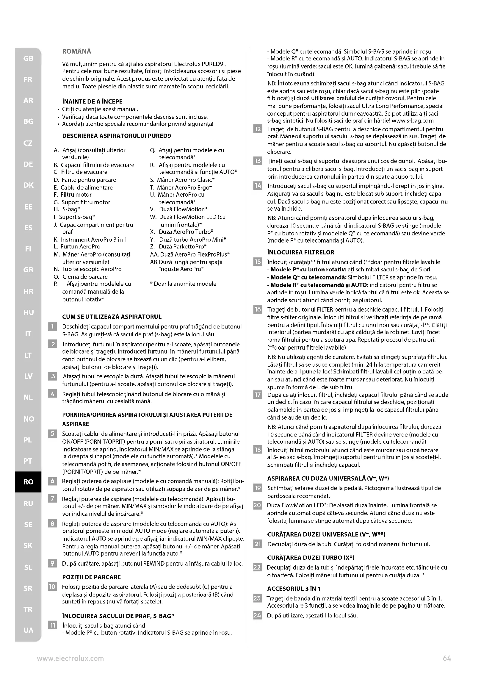 UAROMÂNĂ Vă mulțumim pentru că ați ales aspiratorul Electrolux PURED9 . Pentru cele mai bune rezultate, folosiți întotdeauna accesorii și piese de schimb originale. Acest produs este proiectat cu atenție față de mediu. Toate piesele din plastic sunt marcate în scopul reciclării.
