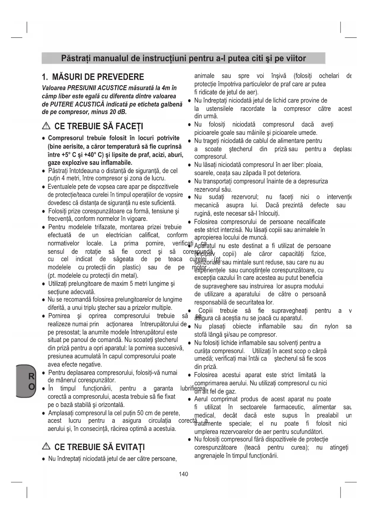 ● Nuîndreptaţiniciodatăjetuldeaercătrepersoane, animale sau spre voi înşivă (folosiţi ochelari de protecţieîmpotrivaparticulelordeprafcarearputea firidicatedejetuldeaer). ● Nuîndreptaţiniciodatăjetuldelichidcareprovinede la ustensilele racordate la compresor către acesta dinurmă. ● Nu folosiţi niciodată compresorul dacă aveţi picioarelegoalesaumâinileşipicioareleumede. ● Nutrageţiniciodatădecabluldealimentarepentru a scoate ştecherul din prizăsau pentrua deplasa compresorul. ● Nulăsaţiniciodatăcompresorulînaerliber:ploaia, soarele,ceaţasauzăpadaîlpotdeteriora. ● Nutransportaţicompresorulînaintedeadepresuriza rezervorulsău. ● Nu sudaţi rezervorul; nu faceţi nici o intervenţie mecanică asupra lui. Dacă prezintă defecte sau rugină,estenecesarsă-lînlocuiţi. ● Folosirea compresorului de persoane necalificate estestrictinterzisă.Nulăsaţicopiiisauanimaleleîn apropierealoculuidemuncă. ● Aparatul nu este destinat a fi utilizat de persoane (inclusiv copii) ale căror capacităţi fizice, senzoriale sau mintale sunt reduse, sau care nu au experienţelesaucunoştinţelecorespunzătoare,cu excepţiacazuluiîncareacesteaaupututbeneficia de supraveghere sau instruirea lor asupra modului de utilizare a aparatului de către o persoană responsabilădesecuritatealor. ● Copiii trebuie să fie supravegheaţi pentru a vă asiguracăaceştianusejoacăcuaparatul. ● Nu plasaţi obiecte inflamabile sau din nylon sau stofălângăşi/saupecompresor. ● Nufolosiţilichideinflamabilesausolvenţipentrua curăţacompresorul. Utilizaţiînacestscopocârpă umedă;verificaţimaiîntâica ştecherulsăfiescos dinpriză. ● Folosirea acestui aparat este strict limitată la comprimareaaerului.Nuutilizaţicompresorulcunici unaltfeldegaz. ● Aerul comprimat produs de acest aparat nu poate fi utilizat în sectoarele farmaceutic, alimentar sau medical, decât dacă este supus în prealabil unor tratamente speciale; el nu poate fi folosit nici la umplerearezervoarelordeaerpentruscufundători. ● Nufolosiţicompresorulfărădispozitiveledeprotecţie corespunzătoare (teacă pentru curea); nu atingeţi angrenajeleîntimpulfuncţionării.141