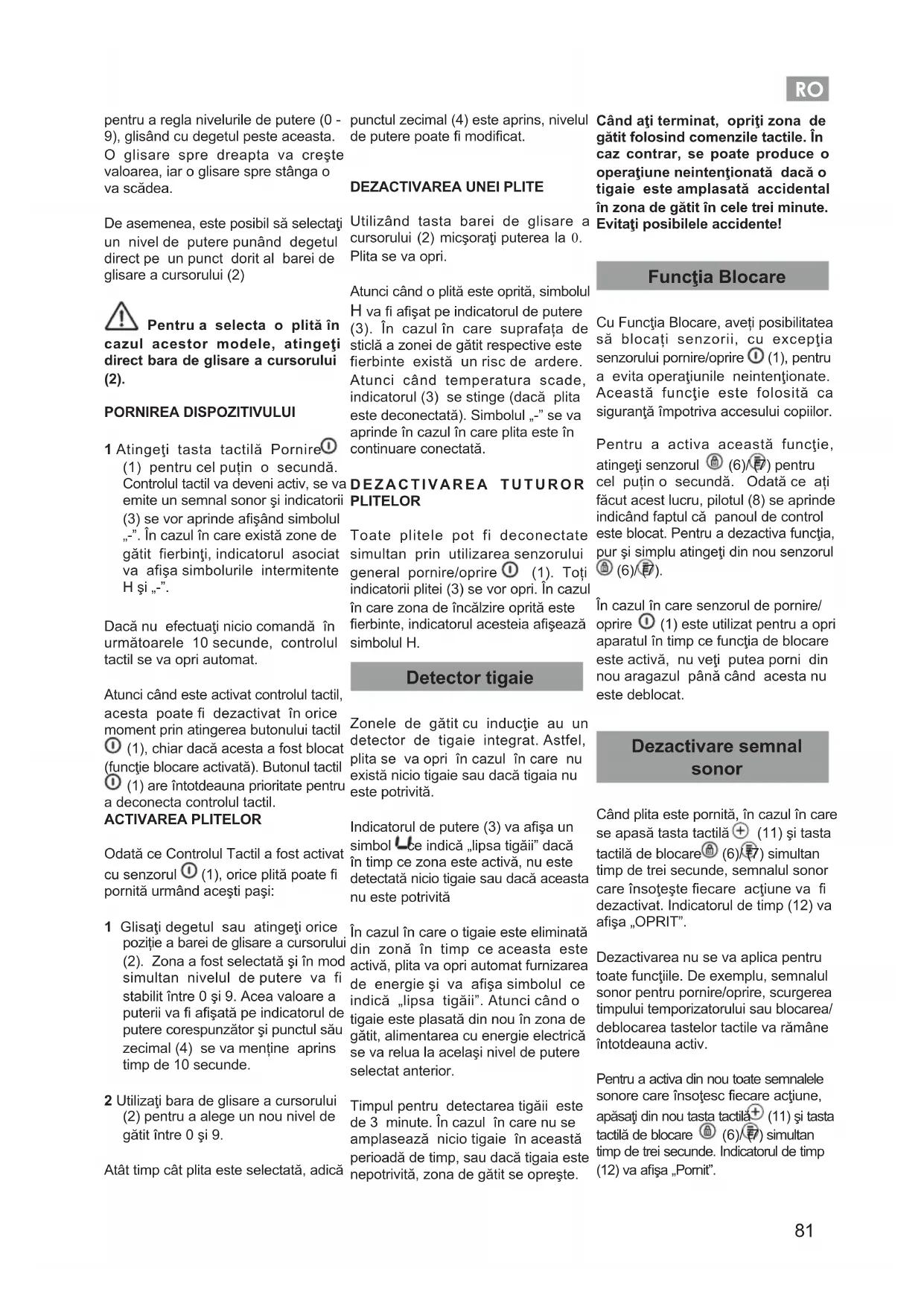 Utilizând tasta barei de glisare a cursorului (2) micşoraţi puterea la 0. Plita se va opri. Atunci când o plită este oprită, simbolul H va aşat pe indicatorul de putere (3). În cazul în care suprafața de sticlă a zonei de gătit respective este fierbinte există un risc de ardere. Atunci când temperatura scade, indicatorul (3) se stinge (dacă plita este deconectată). Simbolul „-” se va aprinde în cazul în care plita este în continuare conectată. DEZACTIVAREA TUTUROR PLITELOR Toate plitele pot fi deconectate simultan prin utilizarea senzorului general pornire/oprire (1). Toți indicatorii plitei (3) se vor opri. În cazul în care zona de încălzire oprită este erbinte, indicatorul acesteia aşează simbolul H. Detector tigaie Zonele de gătit cu inducţie au un detector de tigaie integrat. Astfel, plita se va opri în cazul în care nu există nicio tigaie sau dacă tigaia nu este potrivită. Indicatorul de putere (3) va aşa un simbol ce indică „lipsa tigăii” dacă în timp ce zona este activă, nu este detectată nicio tigaie sau dacă aceasta nu este potrivită În cazul în care o tigaie este eliminată din zonă în timp ce aceasta este activă, plita va opri automat furnizarea de energie şi va afişa simbolul ce indică „lipsa tigăii”. Atunci când o tigaie este plasată din nou în zona de gătit, alimentarea cu energie electrică se va relua la acelaşi nivel de putere selectat anterior. Timpul pentru detectarea tigăii este de 3 minute. În cazul în care nu se amplasează nicio tigaie în această perioadă de timp, sau dacă tigaia este nepotrivită, zona de gătit se opreşte. Când aţi terminat, opriţi zona de gătit folosind comenzile tactile. În caz contrar, se poate produce o operaţiune neintenţionată dacă o tigaie este amplasată accidental în zona de gătit în cele trei minute. Evitaţi posibilele accidente! Funcţia Blocare Cu Funcţia Blocare, aveți posibilitatea să blocați senzorii, cu excepţia senzorului pornire/oprire (1), pentru a evita operaţiunile neintenţionate. Această funcţie este folosită ca siguranţă împotriva accesului copiilor. Pentru a activa această funcţie, atingeţi senzorul (6)/ (7) pentru cel puțin o secundă. Odată ce ați făcut acest lucru, pilotul (8) se aprinde indicând faptul că panoul de control este blocat. Pentru a dezactiva funcţia, pur şi simplu atingeţi din nou senzorul (6)/ (7). În cazul în care senzorul de pornire/ oprire (1) este utilizat pentru a opri aparatul în timp ce funcţia de blocare este activă, nu veţi putea porni din nou aragazul până când acesta nu este deblocat. Dezactivare semnal sonor Când plita este pornită, în cazul în care se apasă tasta tactilă (11) şi tasta tactilă de blocare (6)/ (7) simultan timp de trei secunde, semnalul sonor care însoţeşte ecare acţiune va dezactivat. Indicatorul de timp (12) va aşa „OPRIT”. Dezactivarea nu se va aplica pentru toate funcţiile. De exemplu, semnalul sonor pentru pornire/oprire, scurgerea timpului temporizatorului sau blocarea/ deblocarea tastelor tactile va rămâne întotdeauna activ. Pentru a activa din nou toate semnalele sonore care însoţesc fiecare acţiune, apăsaţi din nou tasta tactilă (11) şi tasta tactilă de blocare (6)/ (7) simultan timp de trei secunde. Indicatorul de timp (12) va aşa „Pornit”.RO