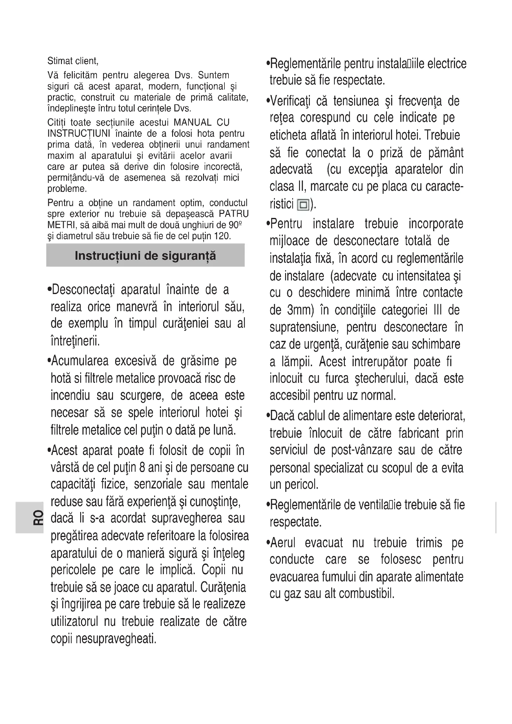 - Je možné, že při instalaci uhlíkových filtrů bude možné pozorovat snížení průtoku odsávání v digestoři. Filtr s aktivním uhlím (Volitelné příslušenství)RO Stimat client, Vă felicităm pentru alegerea Dvs. Suntem siguri că acest aparat, modern, funcţional şi practic, construit cu materiale de primă calitate, îndeplineşte întru totul cerinţele Dvs. Citiţi toate secţiunile acestui MANUAL CU INSTRUCŢIUNI înainte de a folosi hota pentru prima dată, în vederea obţinerii unui randament maxim al aparatului şi evitării acelor avarii care ar putea să derive din folosire incorectă, permiţându-vă de asemenea să rezolvaţi mici probleme. Pentru a obţine un randament optim, conductul spre exterior nu trebuie să depaşească PATRU METRI, să aibă mai mult de două unghiuri de 90º şi diametrul său trebuie să fie de cel puţin 120.
