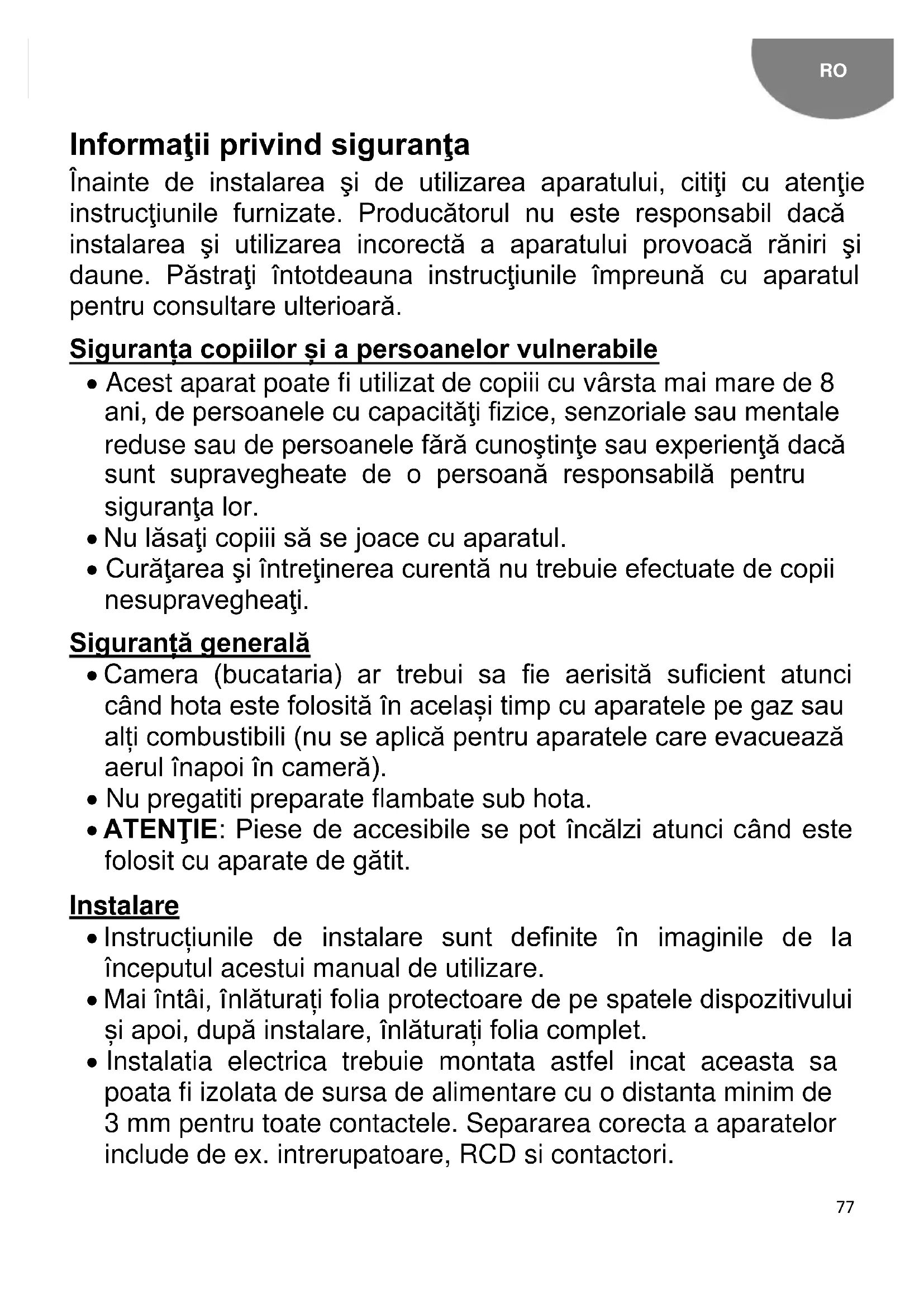 Informaţii privind siguranţa Înainte de instalarea şi de utilizarea aparatului, citiţi cu atenţie instrucţiunile furnizate. Producătorul nu este responsabil dacă instalarea şi utilizarea incorectă a aparatului provoacă răniri şi daune. Păstraţi întotdeauna instrucţiunile împreună cu aparatul pentru consultare ulterioară. Siguranța copiilor și a persoanelor vulnerabile