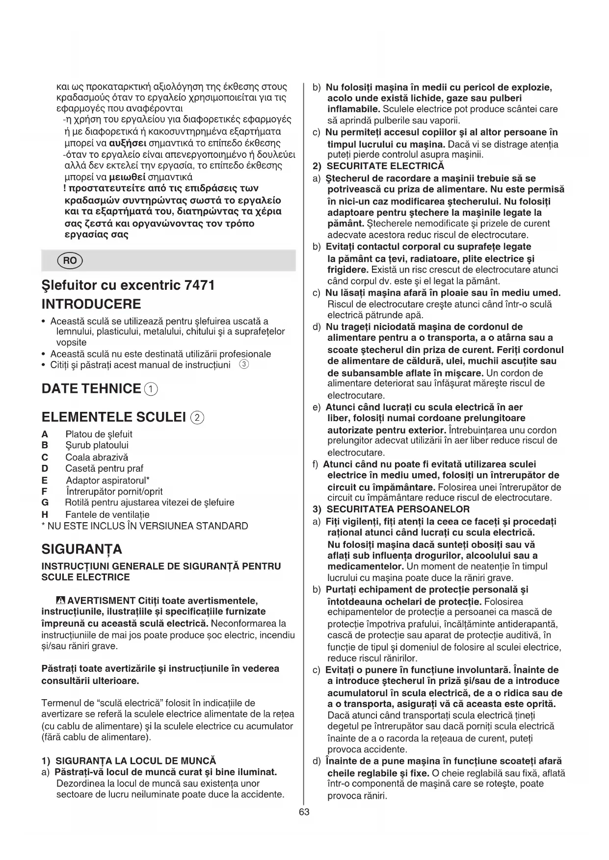 - În timpul şlefuirii de metale sunt împrăştiate scântei; nu folosiţi casetă pentru praf şi nu permiteţi prezenţa altor persoane sau a unor materiale inamabile în perimetrul de activitate e) Nu vă supraapreciaţi. Asiguraţi-vă o poziţie stabilă şi păstraţi-vă întotdeauna echilibrul. Astfel veţi putea controla mai bine maşina în situaţii neaşteptate. f) Purtaţi îmbrăcăminte de lucru adecvată. Nu purtaţi haine largi sau podoabe. Feriţi părul şi îmbrăcămintea de piesele aate în mişcare. Îmbrăcămintea largă, podoabele şi părul lung pot prinse de piesele aate în mişcare. g) Dacă există posibilitatea montării de echipamente şi instalaţii de aspirare şi colectare a prafului, asiguraţi-vă că acestea sunt conectate şi folosite corect. Folosirea unei instalaţii de aspirare a prafului poate duce la reducerea poluării cu praf. h) Nu vă lăsaţi amăgiţi de uşurinţa în operare dobândită în urma folosirii frecvente a sculelor electrice şi nu ignoraţi principiile de siguranţă ale acestora. Neglijenţa poate provoca, într-o fracţiune de secundă, vătămări corporale grave
