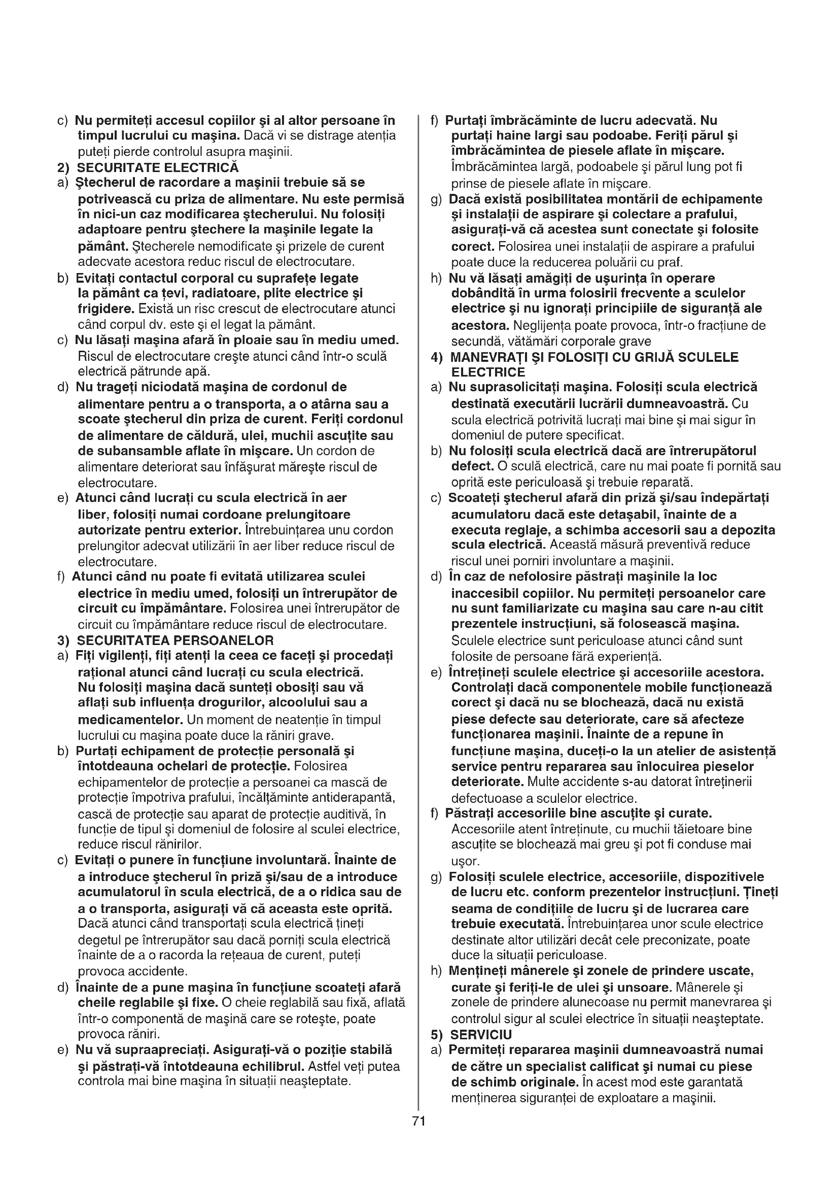 ELECTRICE a) Nu suprasolicitaţi maşina. Folosiţi scula electrică destinată executării lucrării dumneavoastră. Cu scula electrică potrivită lucraţi mai bine şi mai sigur în domeniul de putere specicat. b) Nu folosiţi scula electrică dacă are întrerupătorul defect. O sculă electrică, care nu mai poate pornită sau oprită este periculoasă şi trebuie reparată. c) Scoateţi ştecherul afară din priză şi/sau îndepărtaţi acumulatoru dacă este detaşabil, înainte de a executa reglaje, a schimba accesorii sau a depozita scula electrică. Această măsură preventivă reduce riscul unei porniri involuntare a maşinii. d) În caz de nefolosire păstraţi maşinile la loc inaccesibil copiilor. Nu permiteţi persoanelor care nu sunt familiarizate cu maşina sau care n-au citit prezentele instrucţiuni, să folosească maşina. Sculele electrice sunt periculoase atunci când sunt folosite de persoane fără experienţă. e) Întreţineţi sculele electrice şi accesoriile acestora. Controlaţi dacă componentele mobile funcţionează corect şi dacă nu se blochează, dacă nu există piese defecte sau deteriorate, care să afecteze funcţionarea maşinii. Înainte de a repune în funcţiune maşina, duceţi-o la un atelier de asistenţă service pentru repararea sau înlocuirea pieselor deteriorate. Multe accidente s-au datorat întreţinerii defectuoase a sculelor electrice. f) Păstraţi accesoriile bine ascuţite şi curate. Accesoriile atent întreţinute, cu muchii tăietoare bine ascuţite se blochează mai greu şi pot conduse mai uşor. g) Folosiţi sculele electrice, accesoriile, dispozitivele de lucru etc. conform prezentelor instrucţiuni. Ţineţi seama de condiţiile de lucru şi de lucrarea care trebuie executată. Întrebuinţarea unor scule electrice destinate altor utilizări decât cele preconizate, poate duce la situaţii periculoase. h) Menţineţi mânerele şi zonele de prindere uscate, curate şi feriţi-le de ulei şi unsoare. Mânerele şi zonele de prindere alunecoase nu permit manevrarea şi controlul sigur al sculei electrice în situaţii neaşteptate.