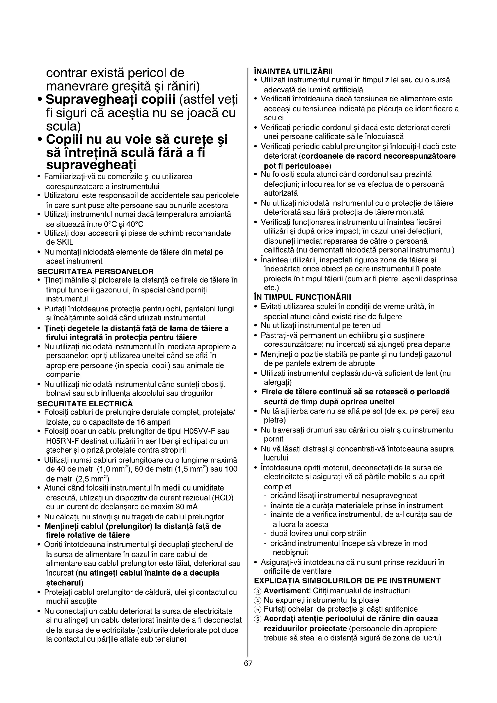 3 Avertisment! Citiţi manualul de instrucţiuni 4 Nu expuneţi instrumentul la ploaie 5 Purtaţi ochelari de protecţie şi căşti antifonice 6 Acordaţi atenţie pericolului de rănire din cauza reziduurilor proiectate (persoanele din apropiere trebuie să stea la o distanţă sigură de zona de lucru)68 7 În cazul în care cablul prelungitor este deteriorat sau secţionat în timpul lucrului, deconectaţi imediat instrumentul de la priză 8 Izolaţie dublă (nu este necesar fir de împământare) 9 Nu aruncaţi instrumentul direct la pubelele de gunoi UTILIZAREA