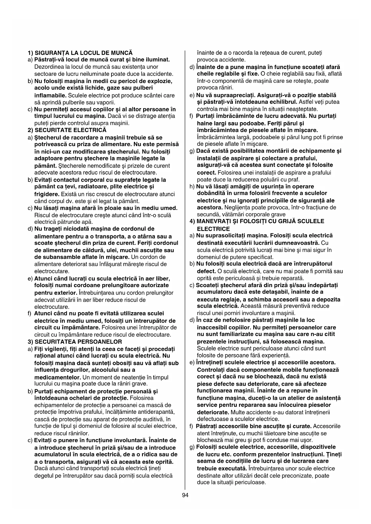 SCULE ELECTRICE AVERTISMENT Citiţi toate avertizările, instrucţiunile, ilustraţiile şi specificaţiile puse la dispoziţie împreună cu această sculă electrică. Nerespectarea instrucţiunilor menţionate mai jos poate duce la electrocutare, incendiu şi/ sau vătămări corporale grave. Păstraţi toate avertizările şi instrucţiunile în vederea consultării ulterioare. Termenul de “sculă electrică” folosit în indicaţiile de avertizare se referă la sculele electrice alimentate de la reţea (cu cablu de alimentare) şi la sculele electrice cu acumulator (fără cablu de alimentare).94