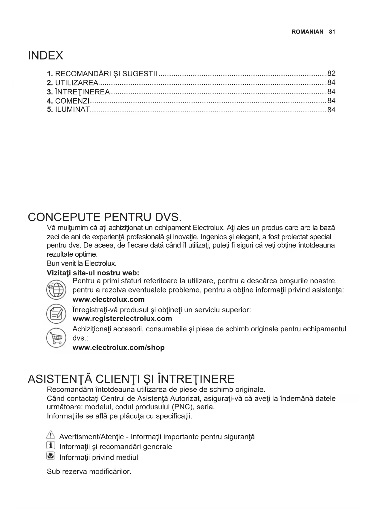 Recomandăm întotdeauna utilizarea de piese de schimb originale. Când contactaţi Centrul de Asistenţă Autorizat, asiguraţi-vă că aveţi la îndemână datele următoare: modelul, codul produsului (PNC), seria. Informaţiile se aă pe plăcuţa cu specicaţii. Avertisment/Atenţie - Informaţii importante pentru siguranţă Informaţii şi recomandări generale Informaţii privind mediul Sub rezerva modicărilor.82 www.electrolux.com