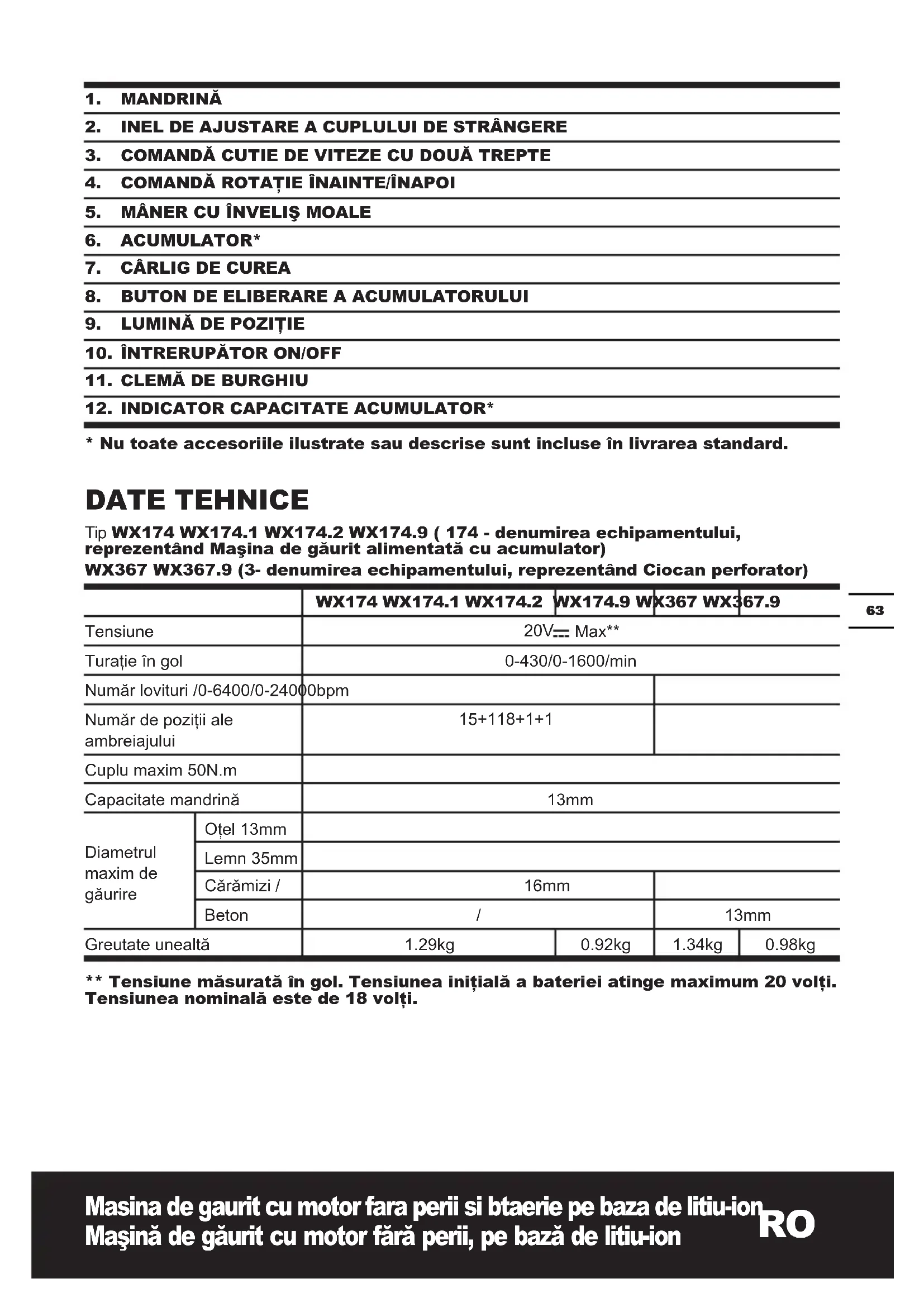 DATE TEHNICE Tip WX174 WX174.1 WX174.2 WX174.9 ( 174 - denumirea echipamentului, reprezentând Maşina de găurit alimentată cu acumulator) WX367 WX367.9 (3- denumirea echipamentului, reprezentând Ciocan perforator) WX174 WX174.1 WX174.2 WX174.9 WX367 WX367.9 Tensiune 20V Max** Turaţie în gol 0-430/0-1600/min Număr lovituri / 0-6400/0-24000bpm Număr de poziţii ale ambreiajului 15+1 18+1+1 Cuplu maxim 50N.m Capacitate mandrină 13mm Diametrul maxim de găurire Oţel 13mm Lemn 35mm Cărămizi / 16mm Beton / 13mm Greutate unealtă 1.29kg 0.92kg 1.34kg 0.98kg ** Tensiune măsurată în gol. Tensiunea iniţială a bateriei atinge maximum 20 volţi. Tensiunea nominală este de 18 volţi.