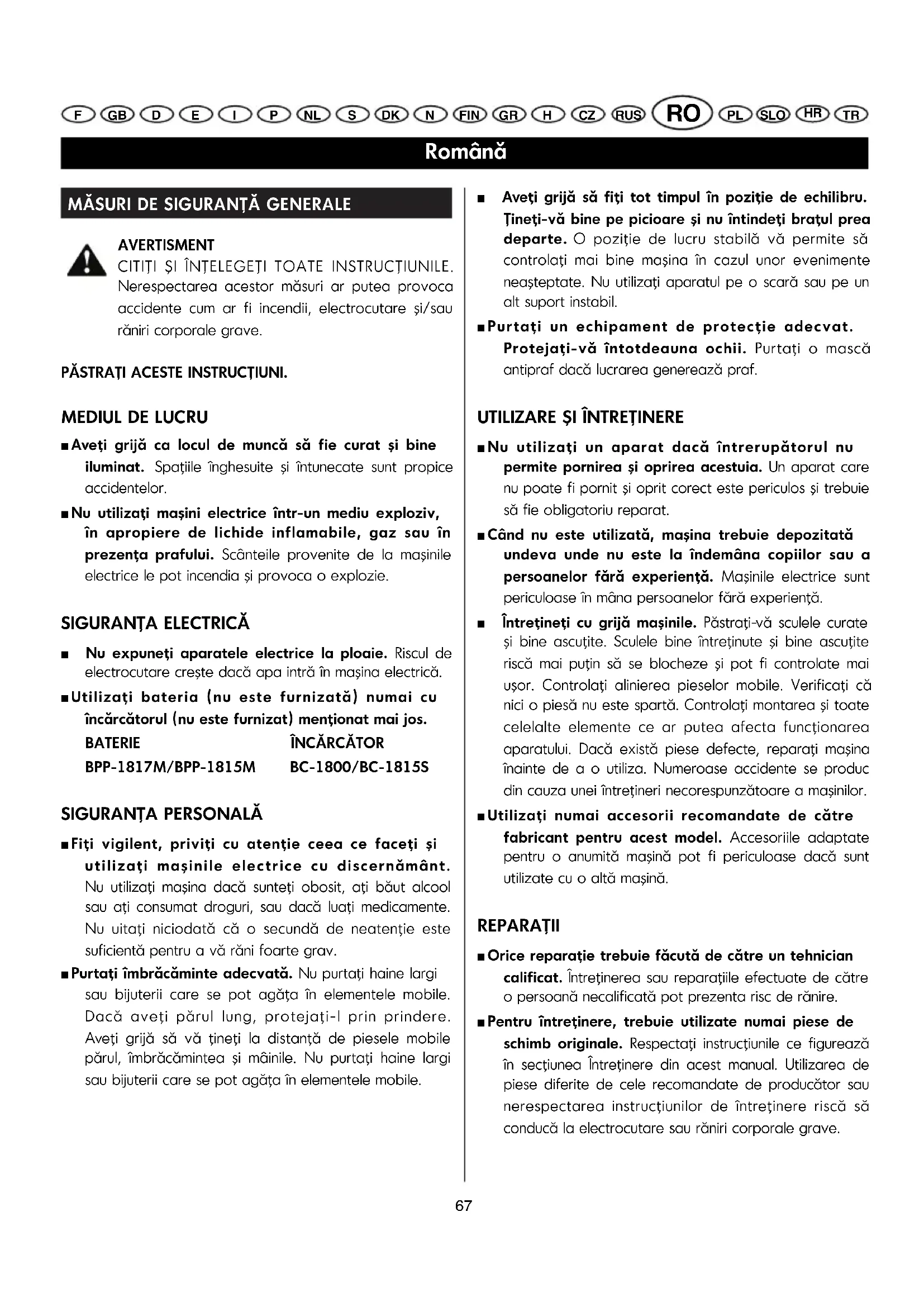 ■ Nu utilizaţi un aparat dacă întrerupătorul nu permite pornirea şi oprirea acestuia. Un aparat care nu poate fi pornit şi oprit corect este periculos şi trebuie să fie obligatoriu reparat. ■ Când nu este utilizată, maşina trebuie depozitată undeva unde nu este la îndemâna copiilor sau a persoanelor fără experienţă. Maşinile electrice sunt periculoase în mâna persoanelor fără experienţă. ■ Întreţineţi cu grijă maşinile. Păstraţi-vă sculele curate şi bine ascuţite. Sculele bine întreţinute şi bine ascuţite riscă mai puţin să se blocheze şi pot fi controlate mai uşor. Controlaţi alinierea pieselor mobile. Verificaţi că nici o piesă nu este spartă. Controlaţi montarea şi toate celelalte elemente ce ar putea afecta funcţionarea aparatului. Dacă există piese defecte, reparaţi maşina înainte de a o utiliza. Numeroase accidente se produc din cauza unei întreţineri necorespunzătoare a maşinilor. ■ Utilizaţi numai accesorii recomandate de către fabricant pentru acest model. Accesoriile adaptate pentru o anumită maşină pot fi periculoase dacă sunt utilizate cu o altă maşină. REPARAŢII ■ Orice reparaţie trebuie făcută de către un tehnician calificat. Întreţinerea sau reparaţiile efectuate de către o persoană necalificată pot prezenta risc de rănire. ■ Pentru întreţinere, trebuie utilizate numai piese de schimb originale. Respectaţi instrucţiunile ce figurează în secţiunea Întreţinere din acest manual. Utilizarea de piese diferite de cele recomandate de producător sau nerespectarea instrucţiunilor de întreţinere riscă să conducă la electrocutare sau răniri corporale grave.