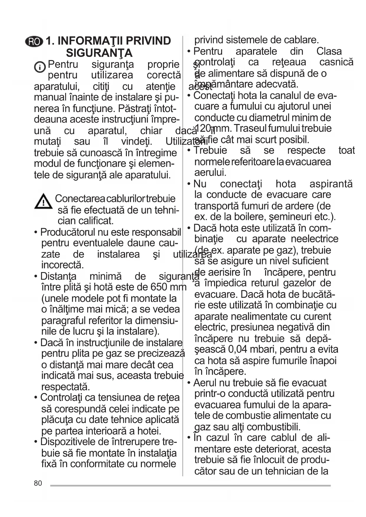 - Nu conectaţi hota aspirantă la conducte de evacuare care transportăfumurideardere(de ex.delaboilere,şemineurietc.).