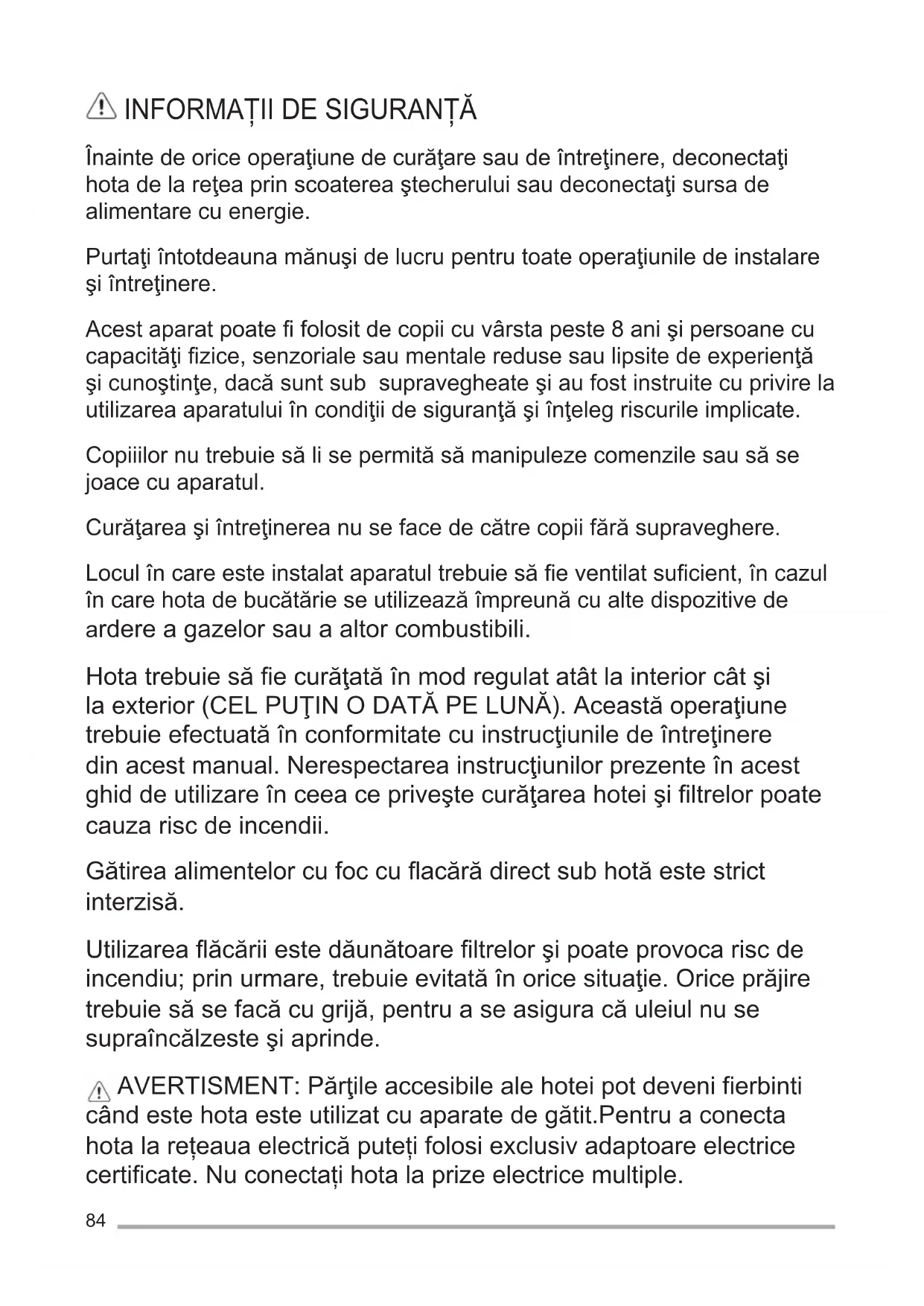 stredná (4.),maximálna(5.). OSVETLENIE Odsávačparyjevybavenýsystémomosvetlenia založenomnatechnoloógiiLED. KontrolkyLEDzaručujúoptimálneosvetlenie, trvanieaž10krátdhlhšieakotradičnéžiarovkya umožňujúušetriť90%elektrickejenergie. Pozor! Nepozerajte sa priamo do svetla kontroliekLED. Prevýmenu,obrátiťsanatechnickýservis.84 INFORMAȚIIDESIGURANȚĂ Înaintedeoriceoperaţiunedecurăţaresaudeîntreţinere,deconectaţi hotadelareţeaprinscoatereaştecheruluisaudeconectaţisursade alimentarecuenergie. Purtaţiîntotdeaunamănuşidelucrupentrutoateoperaţiuniledeinstalare şiîntreţinere. Acestaparatpoatefolositdecopiicuvârstapeste8anişipersoanecu capacităţizice,senzorialesaumentaleredusesaulipsitedeexperienţă şicunoştinţe,dacăsuntsubsupravegheateşiaufostinstruitecuprivirela utilizareaaparatuluiîncondiţiidesiguranţăşiînţelegriscurileimplicate. Copiiilornutrebuiesălisepermităsămanipulezecomenzilesausăse joacecuaparatul. Curăţareaşiîntreţinereanusefacedecătrecopiifărăsupraveghere. Loculîncareesteinstalataparatultrebuiesăeventilatsucient,încazul încarehotadebucătărieseutilizeazăîmpreunăcualtedispozitivede ardereagazelorsauaaltorcombustibili. Hotatrebuiesăecurăţatăînmodregulatatâtlainteriorcâtşi laexterior(CELPUŢINODATĂPELUNĂ).Aceastăoperaţiune trebuieefectuatăînconformitatecuinstrucţiuniledeîntreţinere dinacestmanual.Nerespectareainstrucţiunilorprezenteînacest ghiddeutilizareînceeacepriveştecurăţareahoteişiltrelorpoate cauzariscdeincendii. Gătireaalimentelorcufoccuacărădirectsubhotăestestrict interzisă. Utilizareaăcăriiestedăunătoareltrelorşipoateprovocariscde incendiu;prinurmare,trebuieevitatăînoricesituaţie.Oriceprăjire trebuiesăsefacăcugrijă,pentruaseasiguracăuleiulnuse supraîncălzesteşiaprinde. AVERTISMENT:Părţileaccesibilealehoteipotdevenifierbinti cândestehotaesteutilizatcuaparatedegătit.Pentruaconecta hotalarețeauaelectricăputețifolosiexclusivadaptoareelectrice certificate.Nuconectațihotalaprizeelectricemultiple.85 INSTRUCȚIUNIDESIGURANȚĂ Pentruînlocuireabecurilor,utilizatinumaitipulde becuriindicatînsecţiuneaÎntreţinere/Înlocuirea becurilordinacestmanual. AVERTISMENT!Nuconectaţiaparatulla reţeauaelectricăpânăcândinstalareaeste completterminată. Înceeacepriveştemăsuriletehniceşide siguranţăcaretrebuieadoptatepentruevacuarea fumului,esteimportantsăseurmărească îndeaproapenormelelocale. Sistemul de evacuare a fumului pentru acest aparatnutrebuiesăeconectatlanicisistemde ventilaţieexistentcareestefolositînaltescopuri, cumarevacuareagazelordeardererezultate delaaparateleconsumatoaredegazsaualţi combustibili. Nufolosiţişinulăsaţihotafărăbecmontatcorect dincauzarisculuideelectrocutare. Nufolosiţiniciodatăhotafărăcaaceastasăaibă grilelemontateînmodecient. HotanutrebuieutilizatăNICIODATĂcasuprafaţă desprijindacăacestlucrunuesteprecizatin modexpres. Folosiţinumaişuruburiledexarefurnizate împreunăcuprodusulpentruinstalaresau,în cazulîncarenusuntincluse,achiziţionaţitipul corespunzătordeşuruburi. Use the correct length for the screws which are identiedintheInstallationGuide. Încazdeincertitudine,consultaţiuncentrude asistenţăserviceautorizatsauopersoanăcu calicarecorespunzătoare. AVERTISMENT!Neinstalareaşuruburilor sau a dispozitivul de fixare în conformitate cu acesteinstrucţiunipoateducelapericolelor denaturăelectrică. PROTEJAREAMEDIULUIIN- CONJURATOR Reciclaţimaterialelemarcatecusimbolul . Pentruareciclaambalajele,acesteatrebuiepuse încontainerelecorespunzătoare. Ajutaţilaprotejareamediuluişiasănătăţii umaneşilareciclareadeşeurilordinaparatele electriceşielectrocasnice.Nuaruncaţiaparatele marcate cu acest simbol împreunăcudeşeurile menajere.Returnaţiprodusullacentrullocalde reciclaresaucontactaţiadministraţiaoraşului dvs. UTILIZARE Hotaafostrealizatăpentruautilizatăîn versiuneaaspirantăcuevacuareexternă sau înversiunealtrantăcurecirculareinternă . INSTALAREA Tensiuneadinreţeatrebuiesăcorespundăcu tensiunealacaresereferăetichetasituatăîn interiorulhotei.Dacăesteprevăzutăcuştecher conectaţihotalaoprizăconformcunormeleîn vigoare,poziţionatăîntr-ozonaaccesibilăşidupă instalare.Dacănuesteprevăzutăcuştecher (conexiuneaestedirectlareţea)sauştecherul nuestepoziţionatîntr-ozonăaccesibilăşidupă instalare,aplicaţiunîntrerupătorbipolarlanormă caresăasiguredeconectareacompletădela reţeaîncondiţiilecategorieidesupratensiuneIII, conformregulilordeinstalare. Atenţie!înaintedeaefectuaconectarea circuituluihoteilaalimentaţiadinreţeaşide averificafuncţionareacorectă,controlaţi totdeaunadacăcablulafostmontatînmod corect.86 Distanţaminimăîntresuprafaţasuportului recipientelorpedispozitivuldegătitşiparteade josahoteinutrebuiesăemaimicăde50cmîn cazulmaşinilordegătitelectrice,şide65cmîn cazulmaşinilordegătitcugazsaumixte. Dacăinstrucţiiuniledispozitivuluidegătitcugaz specicăodistanţămaimare,estenecesarsă ţineţicontdeaceasta. ÎNTREŢINERE Atenţie! Înaintedeoriceintervenţiede curăţenieşiîntreţinere,deconectaţihota delareţeauaelectrică,scoţândştecherul saudeconectândîntrerupătorulgeneralal locuinţei. Hotatrebuiecurăţatăfrecvent(celpuţincu aceeaşifrecvenţăcucaresecurăţăltreleanti- grăsime),eîninteriorcâtşiînexterior.Pentru curăţarefolosiţiunmaterialîmbibatcudetergenţi lichizineutri.Evitaţifolosireaproduselorpebază deabraziviNUFOLOSIŢIALCOOL! Atenţie! Nerespectareanormelordecurăţare ahoteişideînlocuireafiltrelorconduce lapotenţialeriscurideincendii.Văsfătuim sărespectaţiîndeaproapeinstrucţiunile prezenteînacestmanual.Producătorul îşideclinăoriceresponsabilitateîncazul daunelor la motor sau incendiilor provocate aparatuluişiderivatedintr-outilizare sauîntreţinereincorectăprecumşidin nerespectareainstrucţiunilorconţinuteîn acestmanual. Filtru anti-grăsimi -Trebuiecurăţatoda