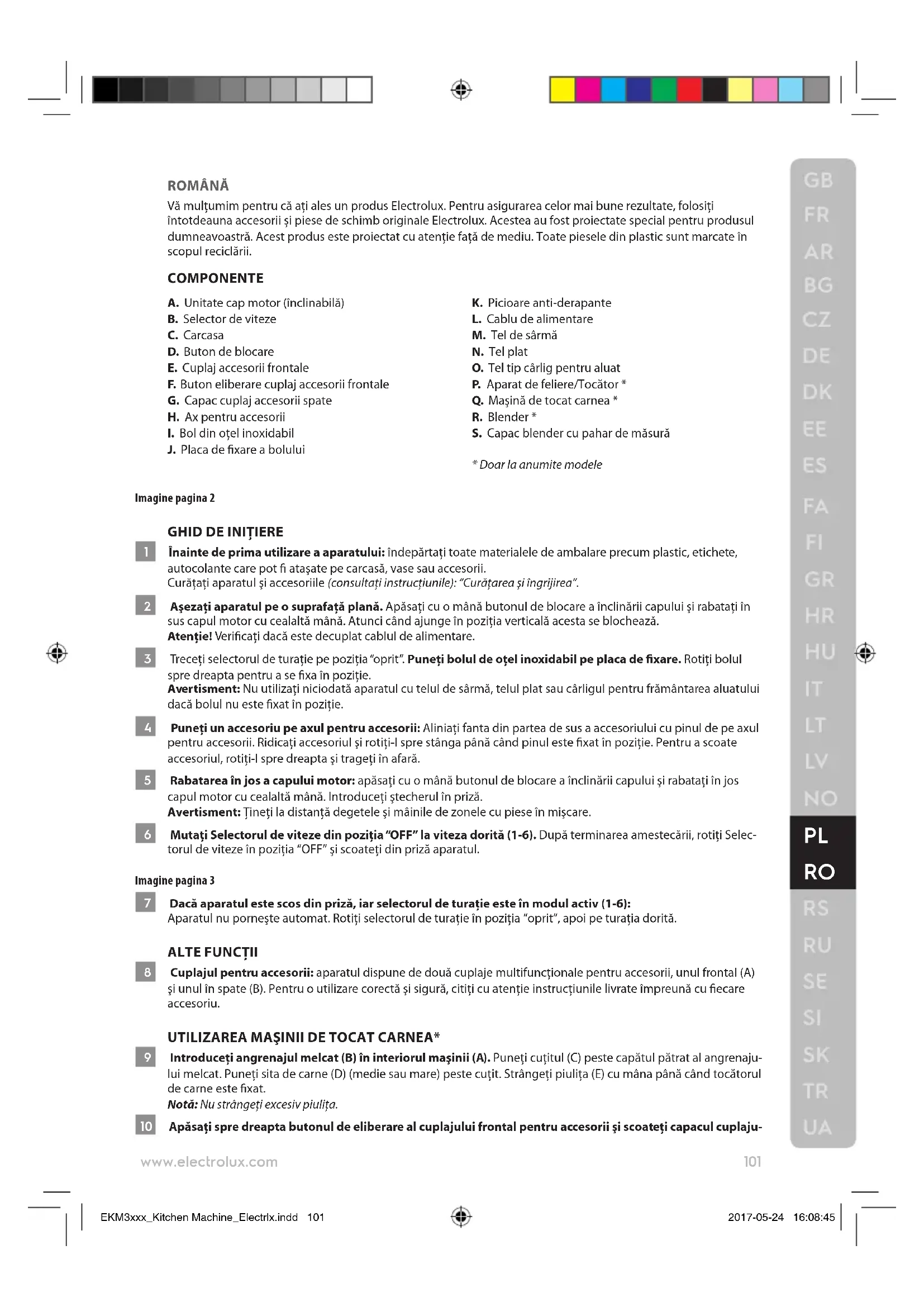 17 Scoateţi din priză aparatul. Telul de sârmă, maşina de tocat carnea* şi aparatul de feliere/tocătorul* trebuie spălate numai manual, în apă caldă cu detergent de vase. Bolul, telul plat şi cârligul pentru frământarea aluatului pot spălate în maşina de spălat vase. Dacă folosiţi o maşină de spălat vase, puneţi piesele componente numai pe suportul superior al acesteia. Atenţie! Lamele şi accesoriile introduse sunt foarte ascuţite şi pot provoca vătămări. Avertisment! Nu scufundaţi niciodată carcasa, ştecherul sau cablul electric în apă sau în alt lichid. Uscaţi bine înainte de utilizare. 18 Curăţarea blenderului*: Rotiţi blenderul în sens anti-orar şi scoateţi-l. Scoateţi capacul. Turnaţi amestecul din blender. Adăugaţi un strop de detergent de vase şi un litru de apă caldă. Fixați blenderul pe aparat. Porniţi aparatul pe turaţia 6 timp de jumătate de minut, apoi aruncaţi apa. Clătiţi blenderul şi lăsaţi-l la uscat. Atenţie! lamele şi accesoriile introduse sunt foarte ascuţite şi pot provoca vătămări. 19 Carcase se curăţă doar cu o lavetă moale şi umedă, apoi se usucă cu o altă lavetă. Notă: a nu se utiliza substanţe de curăţare abrazive sau bureţi abrazivi pentru curăţarea suprafeţelor aparatului. Bucurați-vă de noul dumneavoastră produs Electrolux! EKM3xxx_Kitchen Machine_Electrlx.indd 102 2017-05-24 16:08:46103 www.electrolux.com