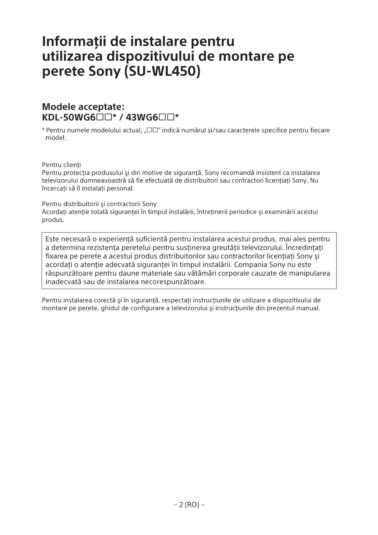 Este necessara o experientă suficientă pentru instalarea acestui produs, mai ales pentru a determinina rezistența peretelui pentru susținerea greutății televizorului. Incredințați fixarea pe perete a acestui produs distribuitorilor sau contractorilor licențiș Sonyși acordati o atenție adecovata sigurantei în timpul instalări. Compania Sony nu este răspunțatoare pentru daune materiale sau vătamări corporale cauzate de manipularea inadeqvata sau de instalarea necorespunțatoare.