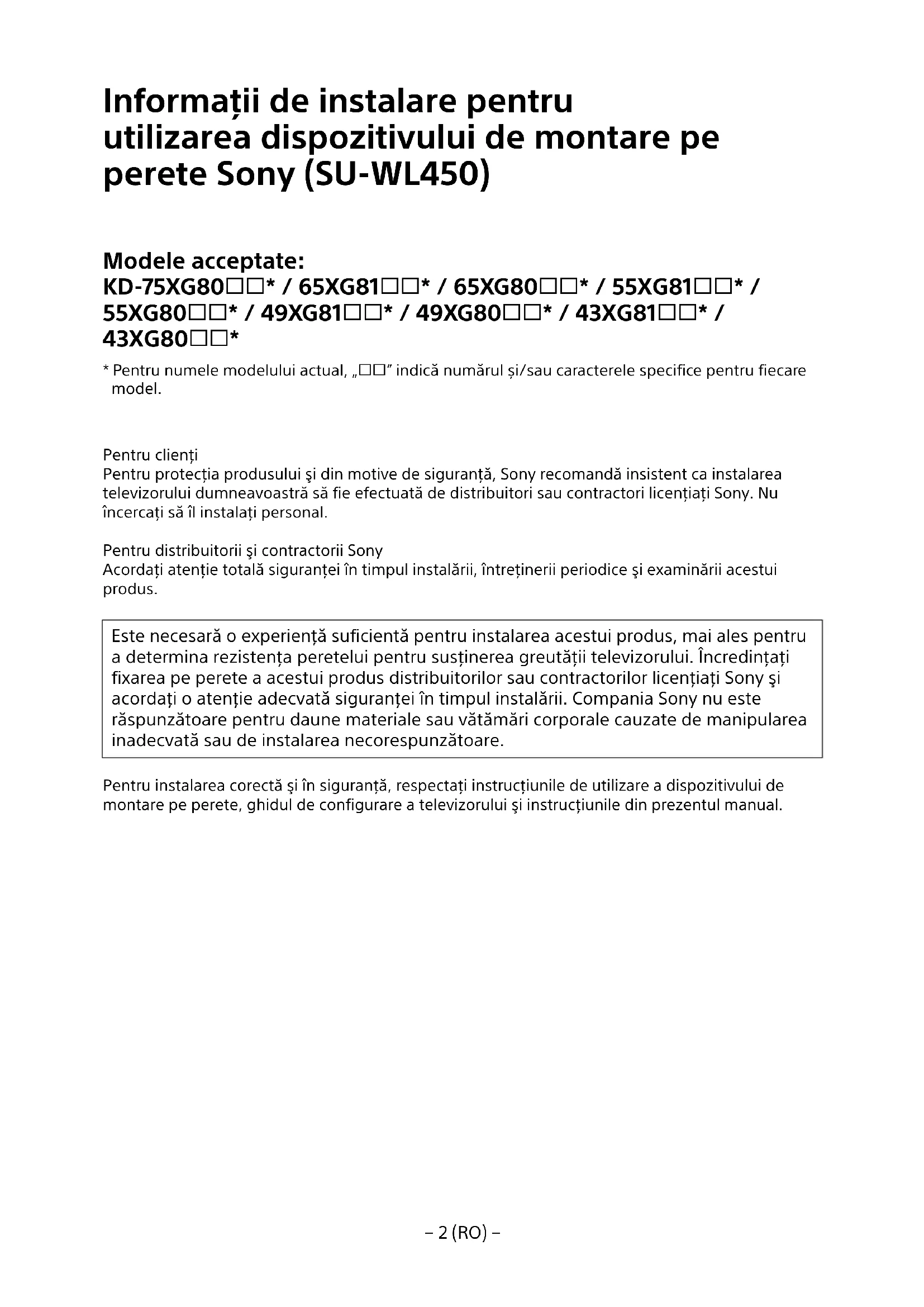 Este necessara o experientă suficientă pentru instalarea acestui produs, mai ales pentru a determinina rezistența peretelui pentru susținerea greutății televizorului. Incredințați fixarea pe perete a acestui produs distribuitorilor sau contractorilor licențiș Sonyși cordatei o atenție adecovata sigurantei în tampul instalări. Compania Sony nu este răspunțatoare pentru daune materiale sau vătămări corporale cauzate de manipularea inadecovata sau de instalarea necorespunțoare.
