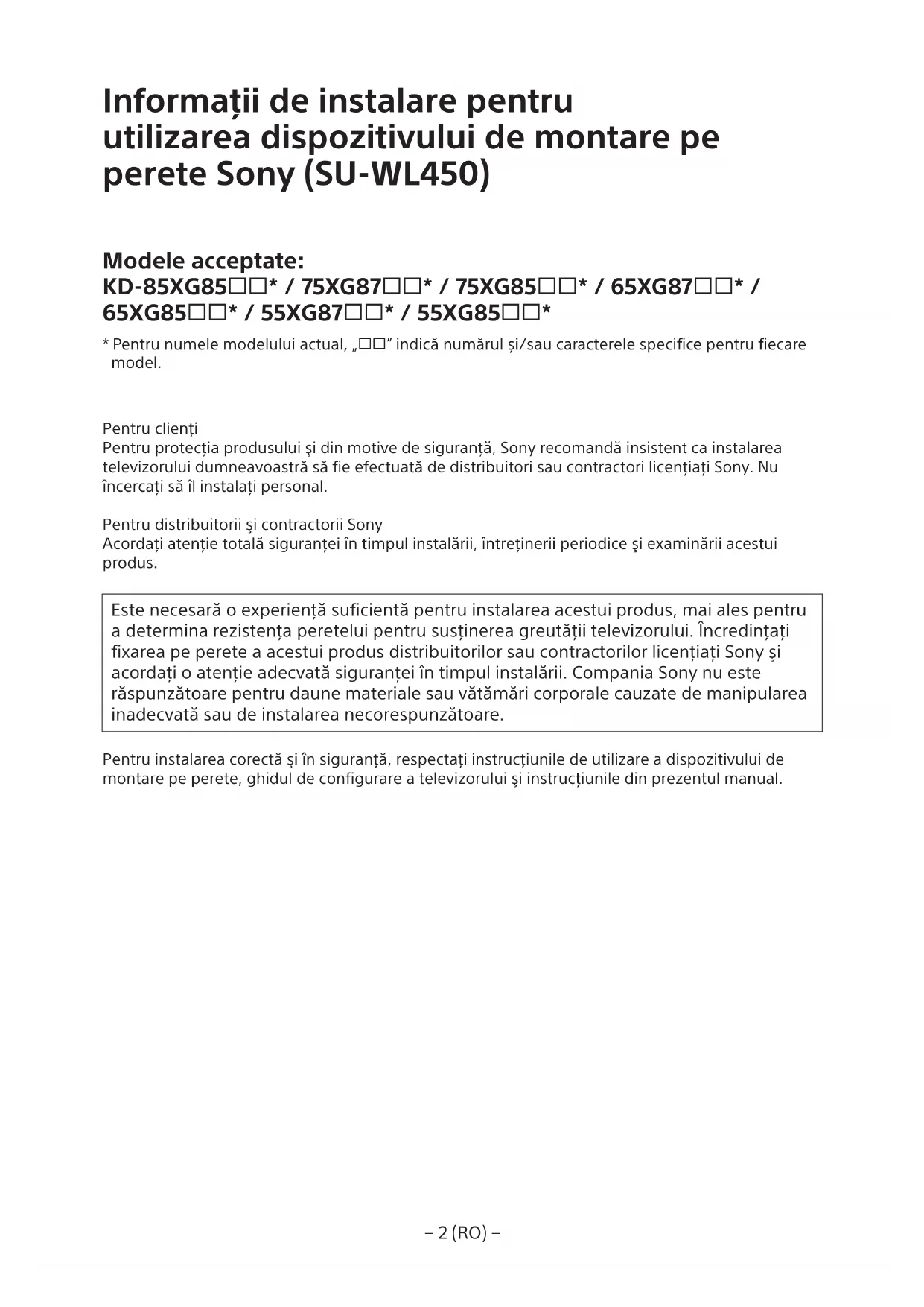 - Pentru numele modelului actual, „” indică numărul și/sau caracterele specifice pentru fiecare model. Pentru clienţi Pentru protecţia produsului şi din motive de siguranţă, Sony recomandă insistent ca instalarea televizorului dumneavoastră să fie efectuată de distribuitori sau contractori licenţiaţi Sony. Nu încercaţi să îl instalaţi personal. Pentru distribuitorii şi contractorii Sony Acordaţi atenţie totală siguranţei în timpul instalării, întreţinerii periodice şi examinării acestui produs. Este necesară o experienţă suficientă pentru instalarea acestui produs, mai ales pentru a determina rezistenţa peretelui pentru susţinerea greutăţii televizorului. Încredinţaţi fixarea pe perete a acestui produs distribuitorilor sau contractorilor licenţiaţi Sony şi acordaţi o atenţie adecvată siguranţei în timpul instalării. Compania Sony nu este răspunzătoare pentru daune materiale sau vătămări corporale cauzate de manipularea inadecvată sau de instalarea necorespunzătoare. Pentru instalarea corectă şi în siguranţă, respectaţi instrucţiunile de utilizare a dispozitivului de montare pe perete, ghidul de configurare a televizorului şi instrucţiunile din prezentul manual.− 3 (RO) −