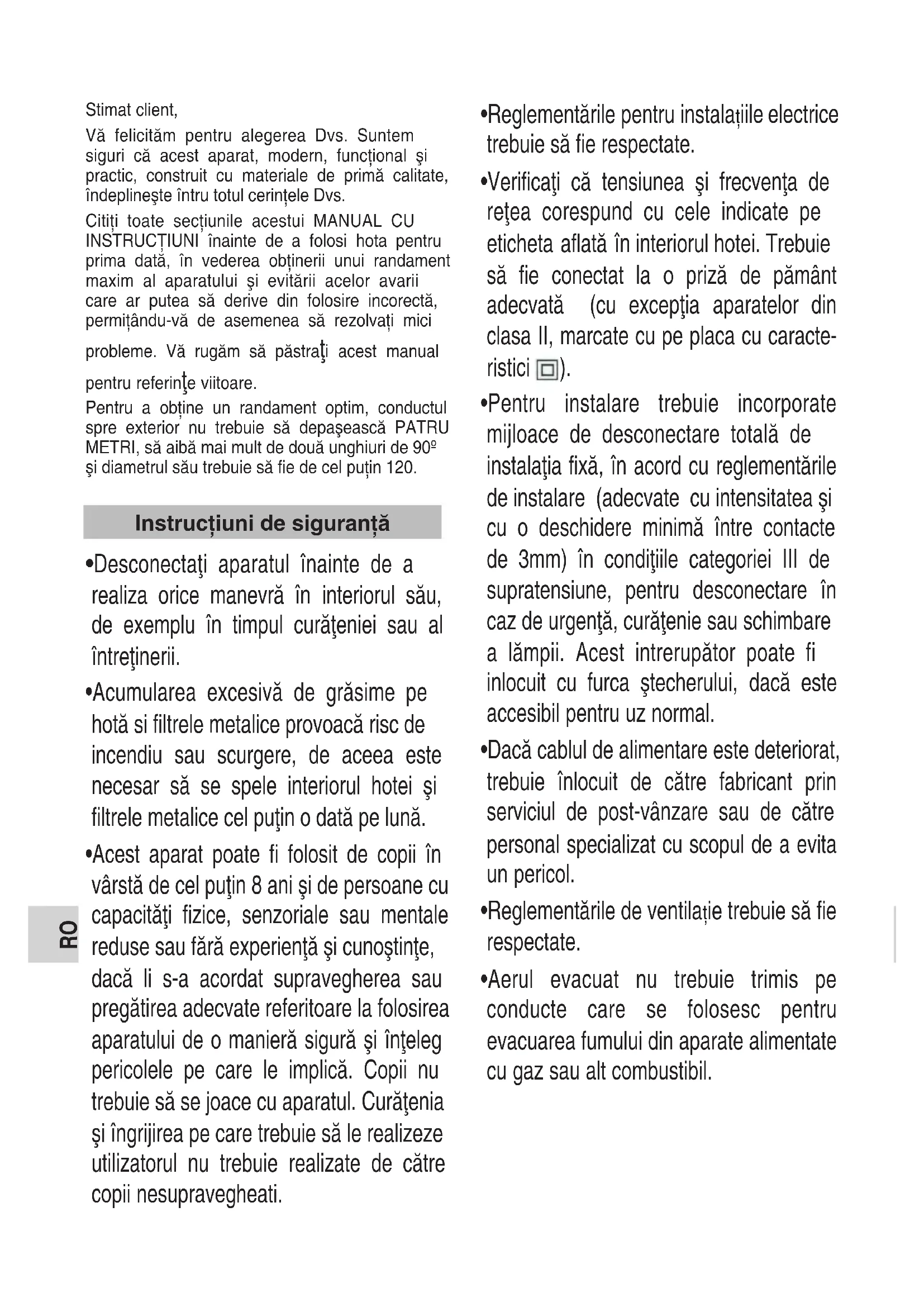 Stimat client, Vă felicităm pentru alegerea Dvs. Suntem siguri că acest aparat, modern, funcţional şi practic, construit cu materiale de primă calitate, îndeplineşte întru totul cerinţele Dvs. Citiţi toate secţiunile acestui MANUAL CU INSTRUCŢIUNI înainte de a folosi hota pentru prima dată, în vederea obţinerii unui randament maxim al aparatului şi evitării acelor avarii care ar putea să derive din folosire incorectă, permiţându-vă de asemenea să rezolvaţi mici probleme. Vă rugăm să păstraţi acest manual pentru referinţe viitoare. Pentru a obţine un randament optim, conductul spre exterior nu trebuie să depaşească PATRU METRI, să aibă mai mult de două unghiuri de 90º şi diametrul său trebuie să fie de cel puţin 120.
