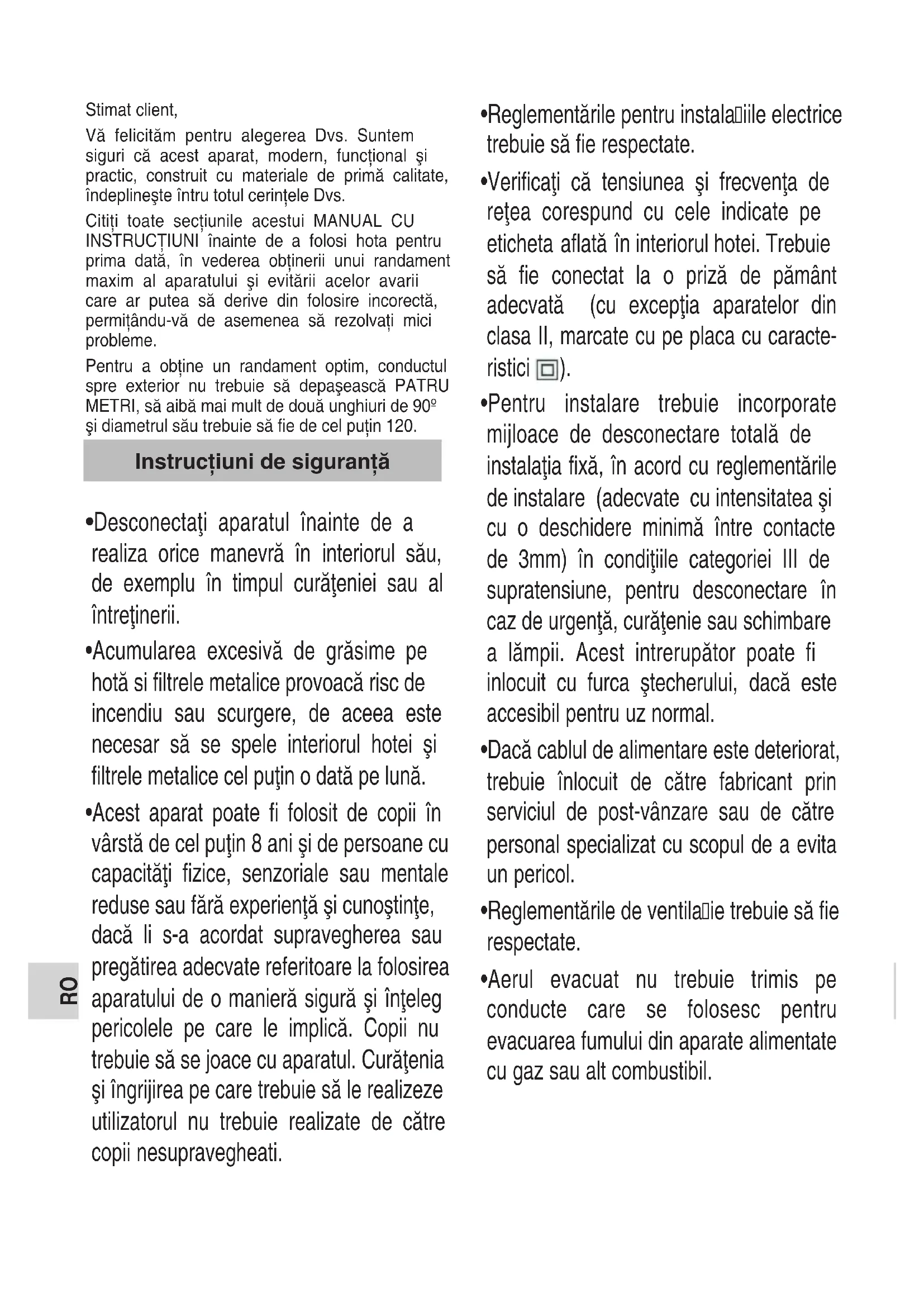 - Je možné, že při instalaci uhlíkových filtrů bude možné pozorovat snížení průtoku odsávání v digestoři. Filtr s aktivním uhlím (Volitelné příslušenství)RO Stimat client, Vă felicităm pentru alegerea Dvs. Suntem siguri că acest aparat, modern, funcţional şi practic, construit cu materiale de primă calitate, îndeplineşte întru totul cerinţele Dvs. Citiţi toate secţiunile acestui MANUAL CU INSTRUCŢIUNI înainte de a folosi hota pentru prima dată, în vederea obţinerii unui randament maxim al aparatului şi evitării acelor avarii care ar putea să derive din folosire incorectă, permiţându-vă de asemenea să rezolvaţi mici probleme. Pentru a obţine un randament optim, conductul spre exterior nu trebuie să depaşească PATRU METRI, să aibă mai mult de două unghiuri de 90º şi diametrul său trebuie să fie de cel puţin 120.