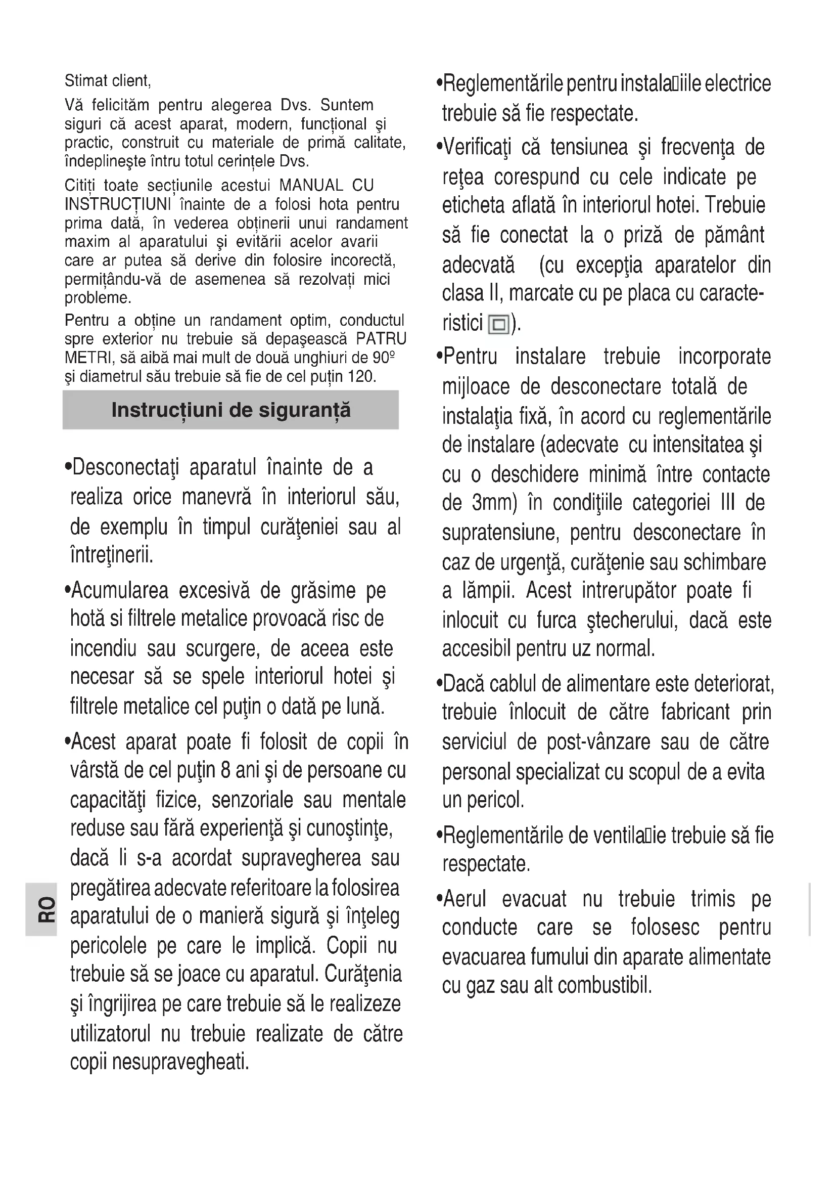 Řešení problémů Než zavoláte technický servis, zkontrolujte následující: Závada Možná příčina Řešení Odsavač nefunguje. Je odpojený přívodní kabel. V elektrické síti není proud. Zapojte kabel do sítě. Zkontrolujte/obnovte dodávku proudu. Odsavač má snížený výkon nebo vibruje. Ve filtru se nahromadilo příliš tuku. Zablokovaný vývod. Vyčistěte nebo vyměňte filtr. Odstraňte z vývodu překážku.RO Stimat client, Vă felicităm pentru alegerea Dvs. Suntem siguri că acest aparat, modern, funcţional şi practic, construit cu materiale de primă calitate, îndeplineşte întru totul cerinţele Dvs. Citiţi toate secţiunile acestui MANUAL CU INSTRUCŢIUNI înainte de a folosi hota pentru prima dată, în vederea obţinerii unui randament maxim al aparatului şi evitării acelor avarii care ar putea să derive din folosire incorectă, permiţându-vă de asemenea să rezolvaţi mici probleme. Pentru a obţine un randament optim, conductul spre exterior nu trebuie să depaşească PATRU METRI, să aibă mai mult de două unghiuri de 90º şi diametrul său trebuie să fie de cel puţin 120.